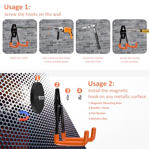 - 4 pcs magnet hooks for hanging: The magnet hooks are ready for use on any steel surfaces you already have in the garage, fridge, garden, workshop, container, barn, shed, tool chest, work van, or outdoor.