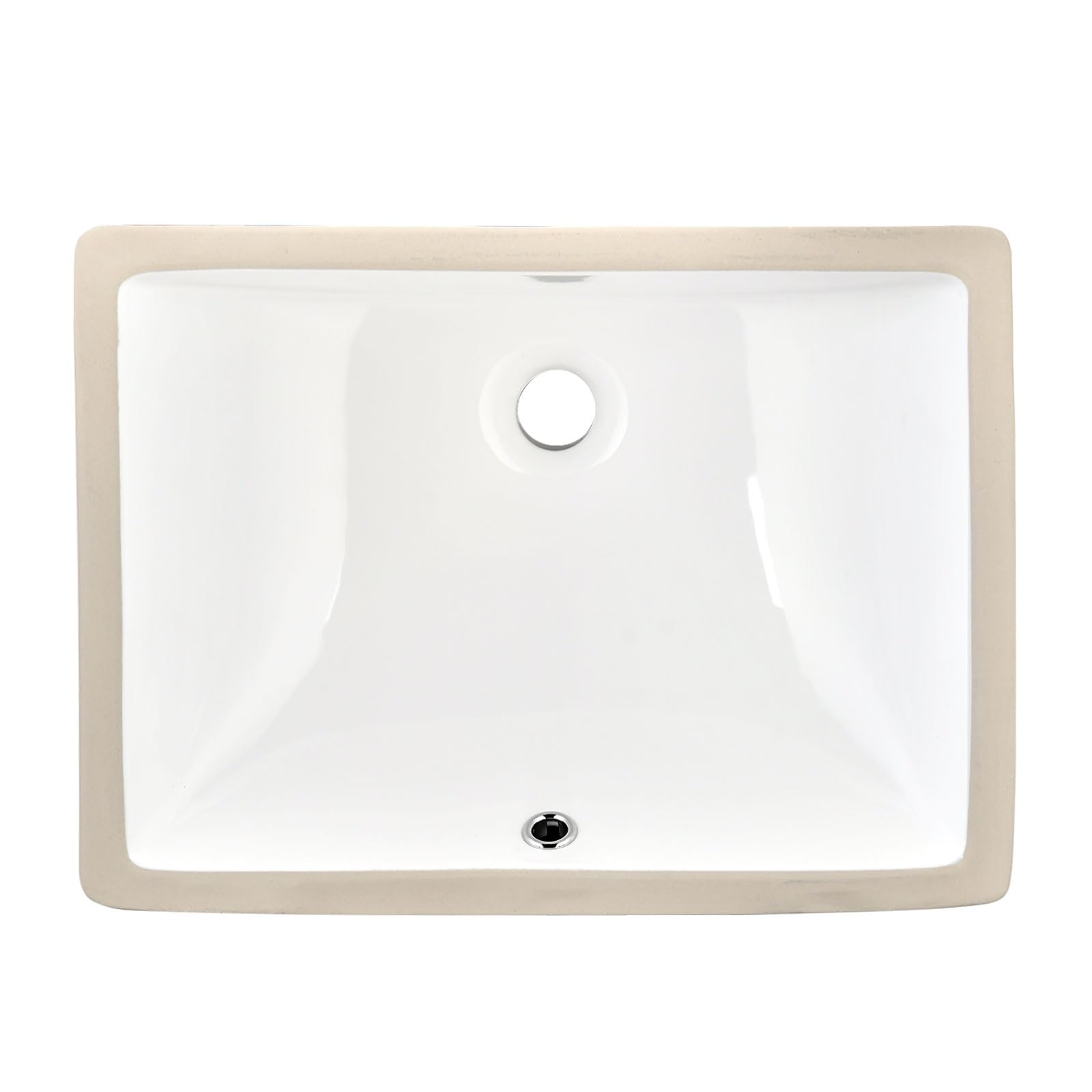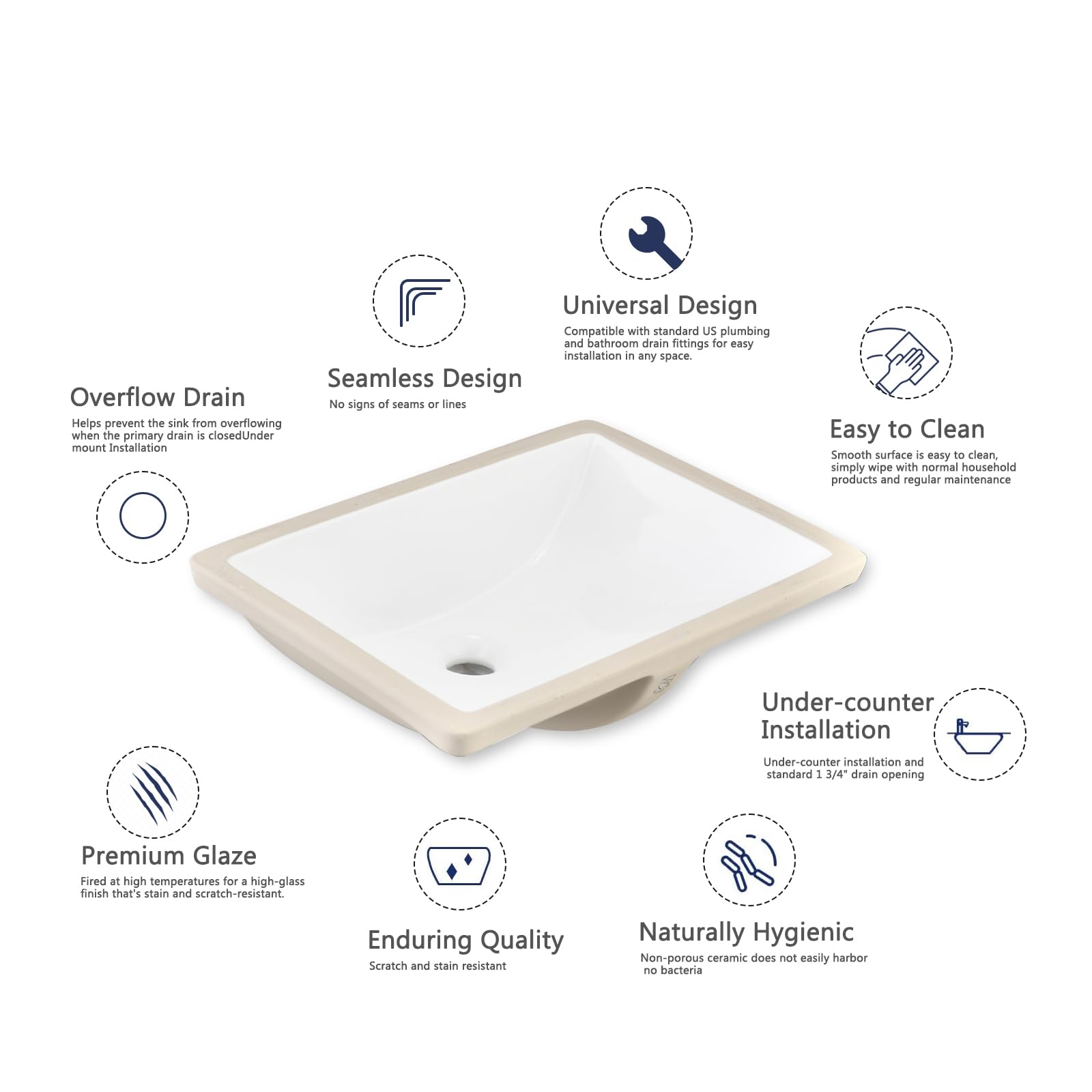 - High-Quality Rectangular Sink: This white rectangular undermount bathroom sink is meticulously crafted from high-quality ceramic material using a high-temperature firing process. It exhibits exceptional characteristics such as low water absorption, acid resistance, a smooth polished surface, and remarkable resistance to scratches and stains, facilitating effortless cleaning. The sink is thoughtfully designed with an overflow hole to prevent overfilling, ensuring optimal functionality.