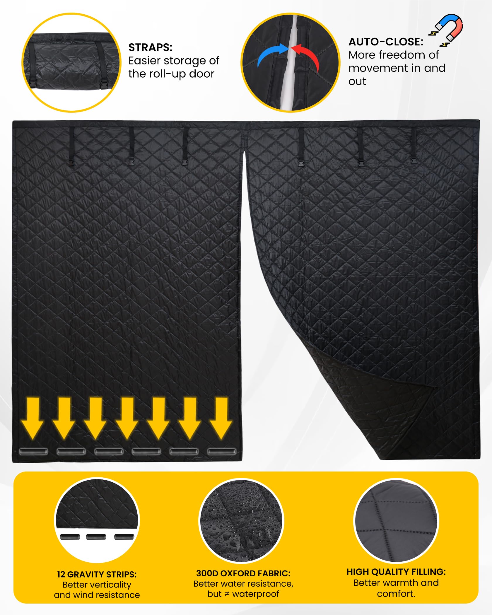 - Effortless Installation: We’ve designed a Velcro fastening system that eliminates the need for complex installation steps, allowing you to complete the setup without professional tools. Additionally, the curtain features a weighted bottom that ensures a close fit to the ground, effectively blocking out cold drafts and improving the seal, so you can enjoy instant warmth and protection once installed.
