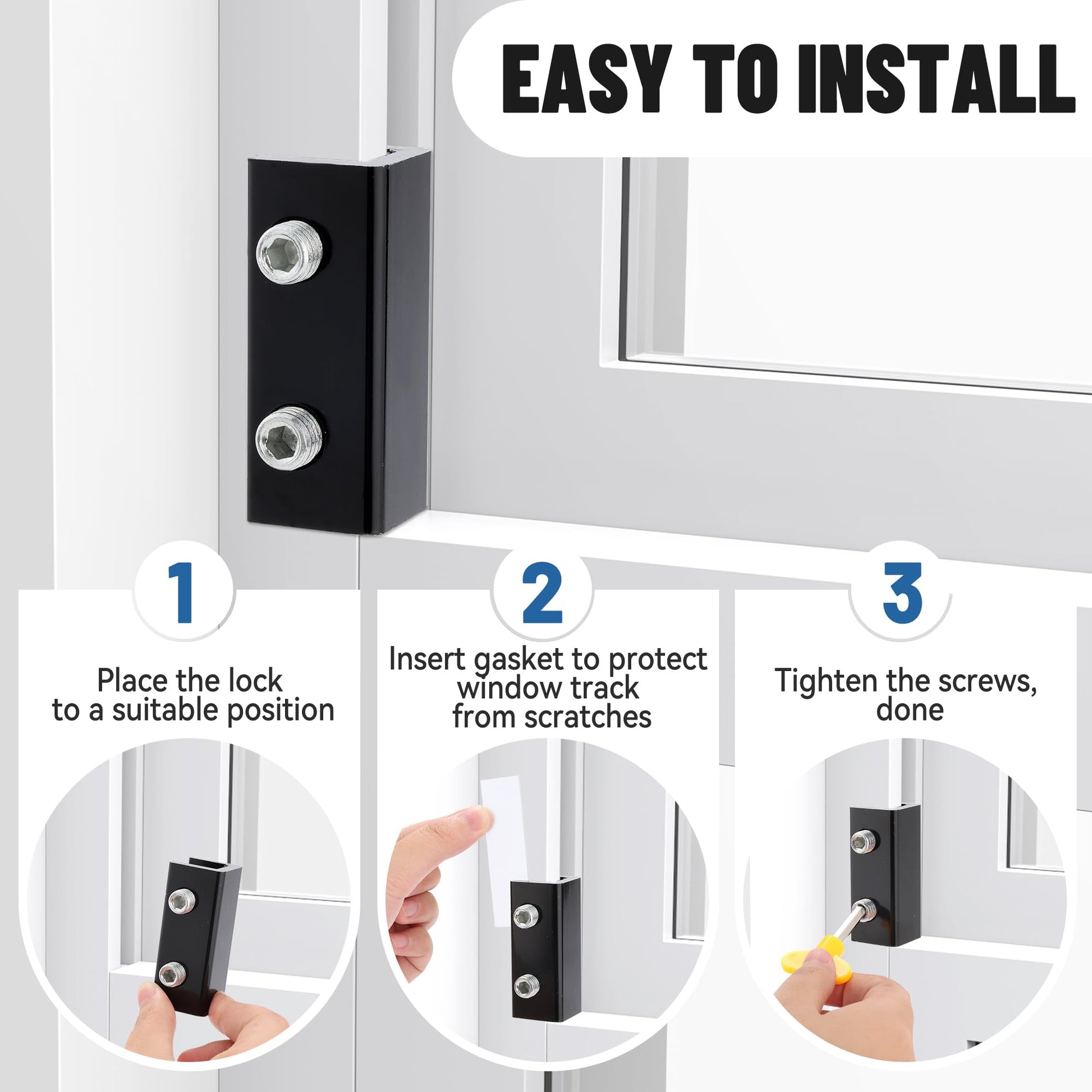- Upgraded Double Screw Locks: Each aluminum alloy window security lock has 2 fixing holes, effectively improve stability and enhance the holding power of the lock, make it more firmly on the window/door tracks, and equipped with gaskets to protect the tracks away from scratches