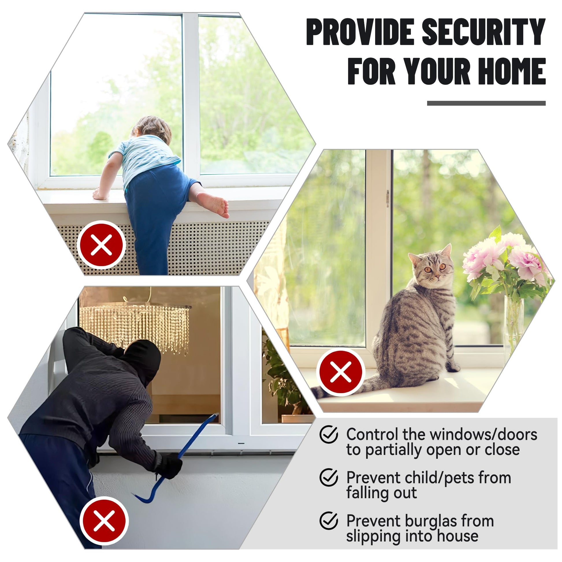 - Multifunctional Use: Window stopper can be used for patio/balcony sliding glass door, living room/bedroom/kindergarten sliding windows, control the windows/doors to partially open or close, ensuring ventilation while reducing the risk of children or pets falling from high windows
