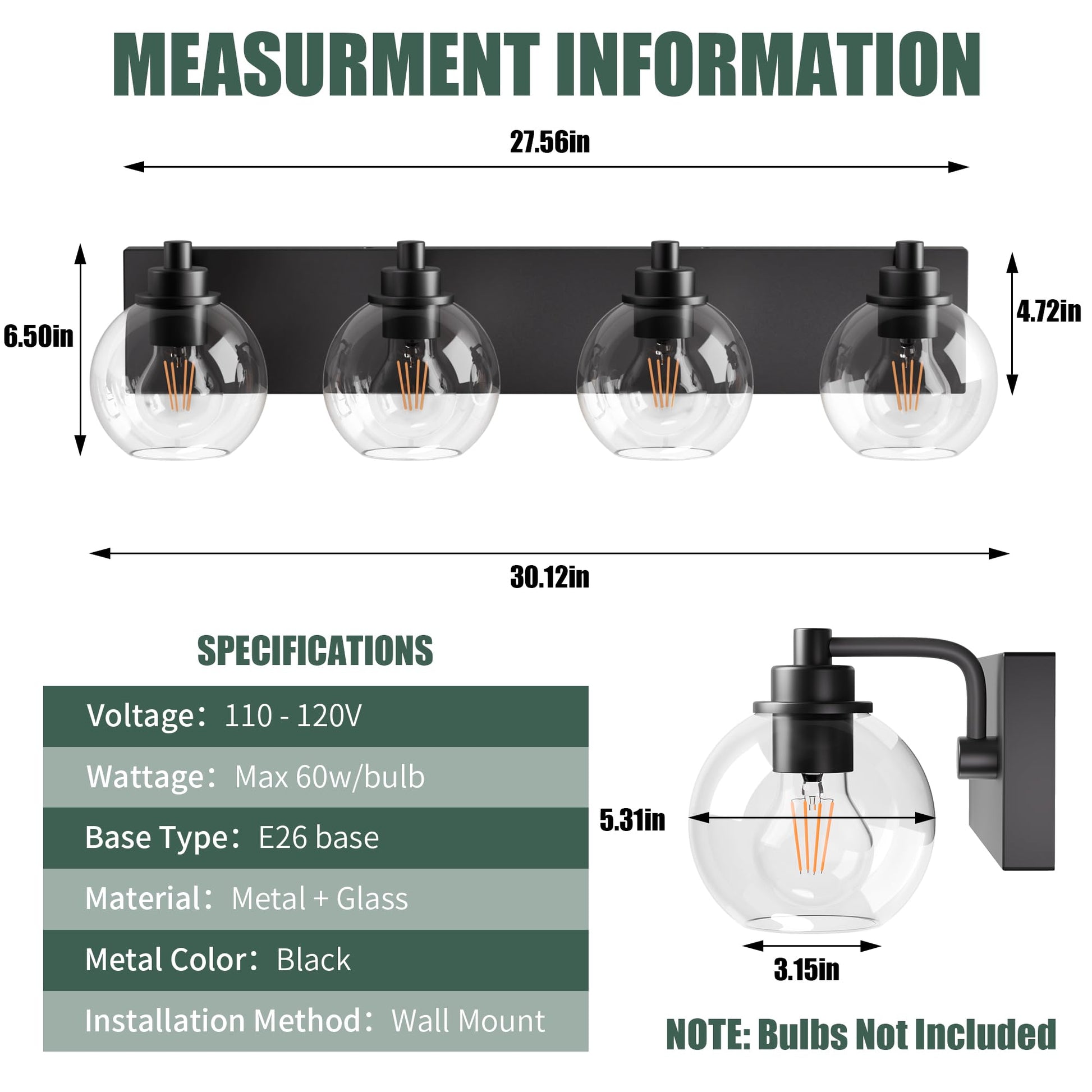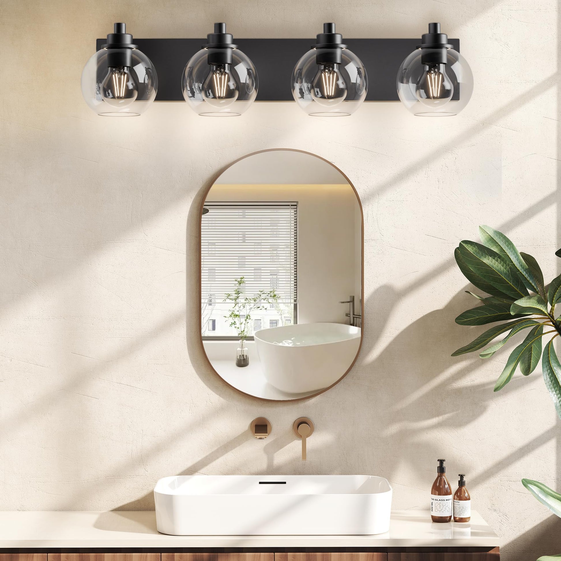 - EXQUISITE DESIGN: Exquisite design makes the modern black vanity lights a standout! With clear glass globes softly diffuse light and create warm ambient lighting, while the black metal add a modern chic element to your spaces. Boasting an attractive and unique design, matte black bathroom vanity light will put you in a good mood every day as you stand in front of the mirror.