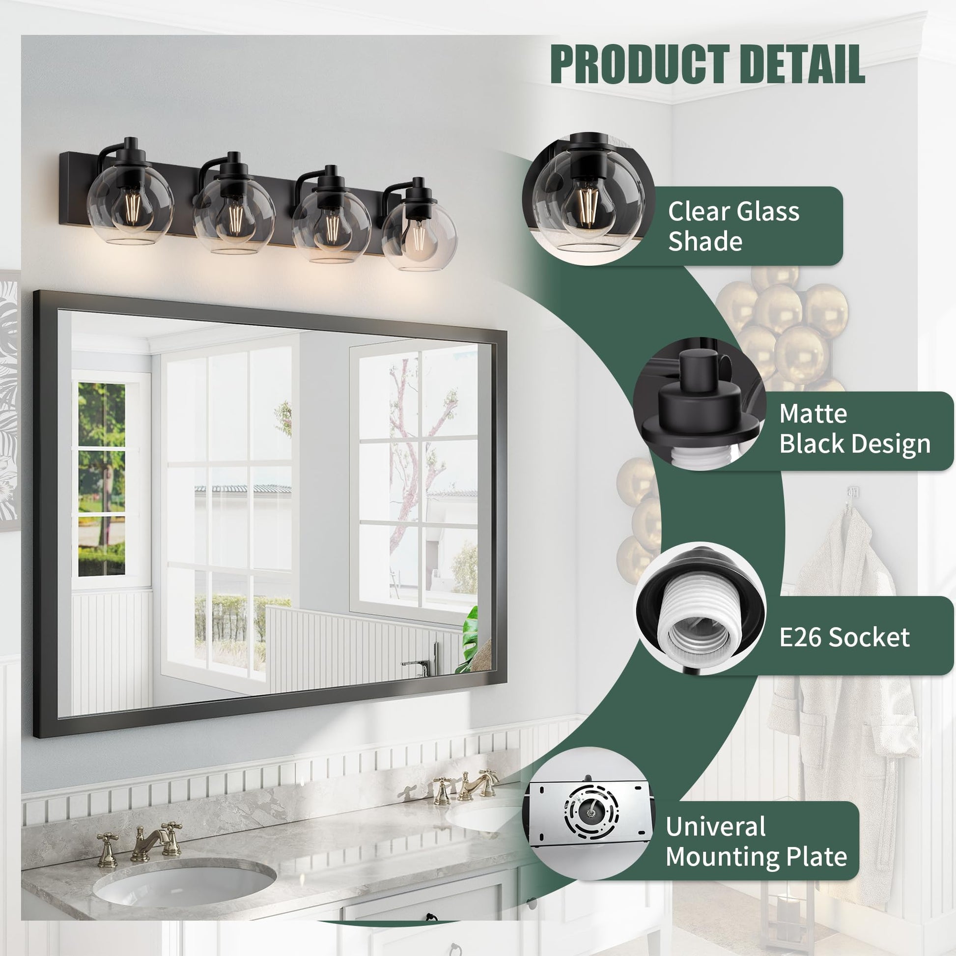 Espird Bathroom Light Fixtures-Matte Black Vanity Lights for Bathroom, Modern Black Vanity Lights 4-Light Bathrooms Lighting Fixtures Over Mirror with Clear Glass Shade