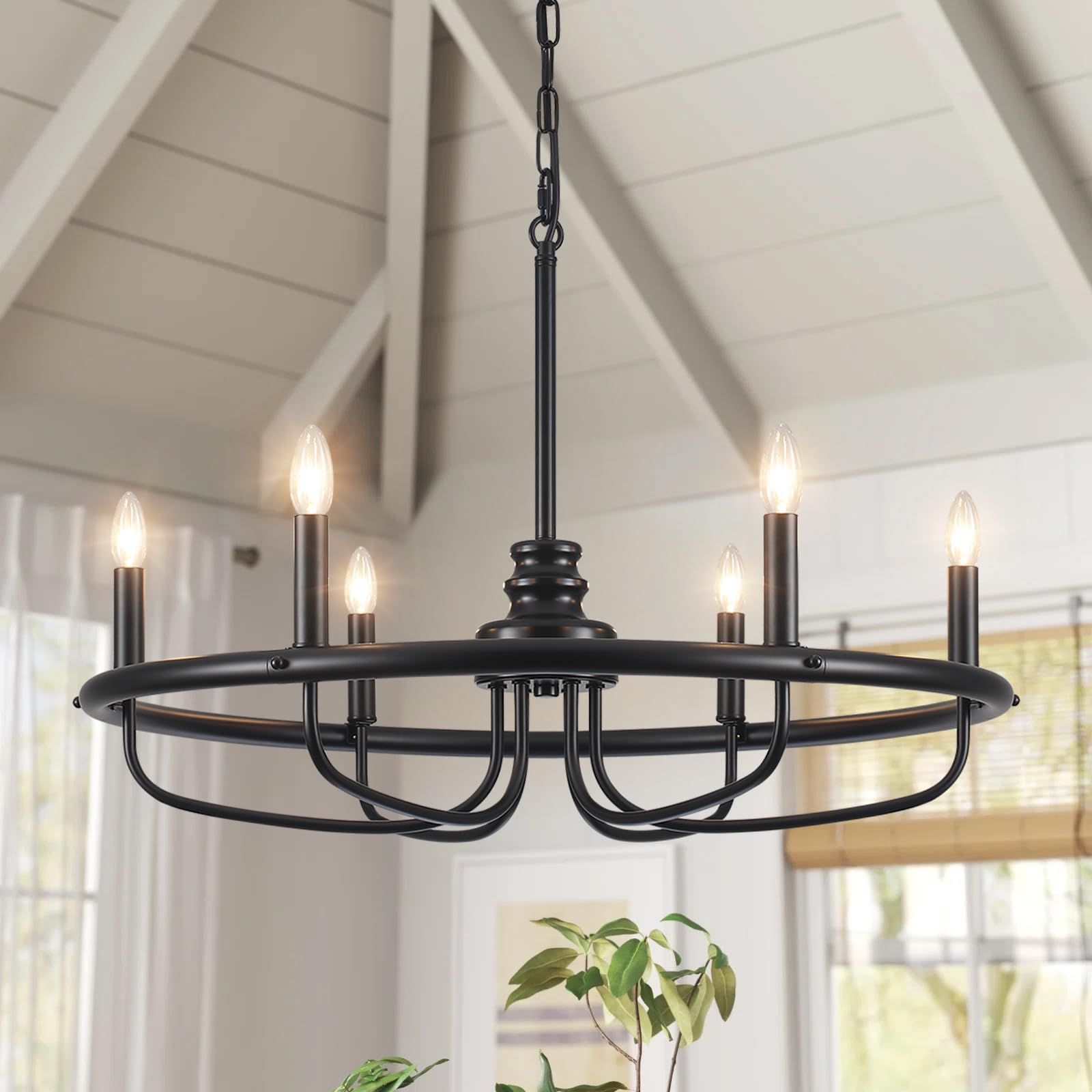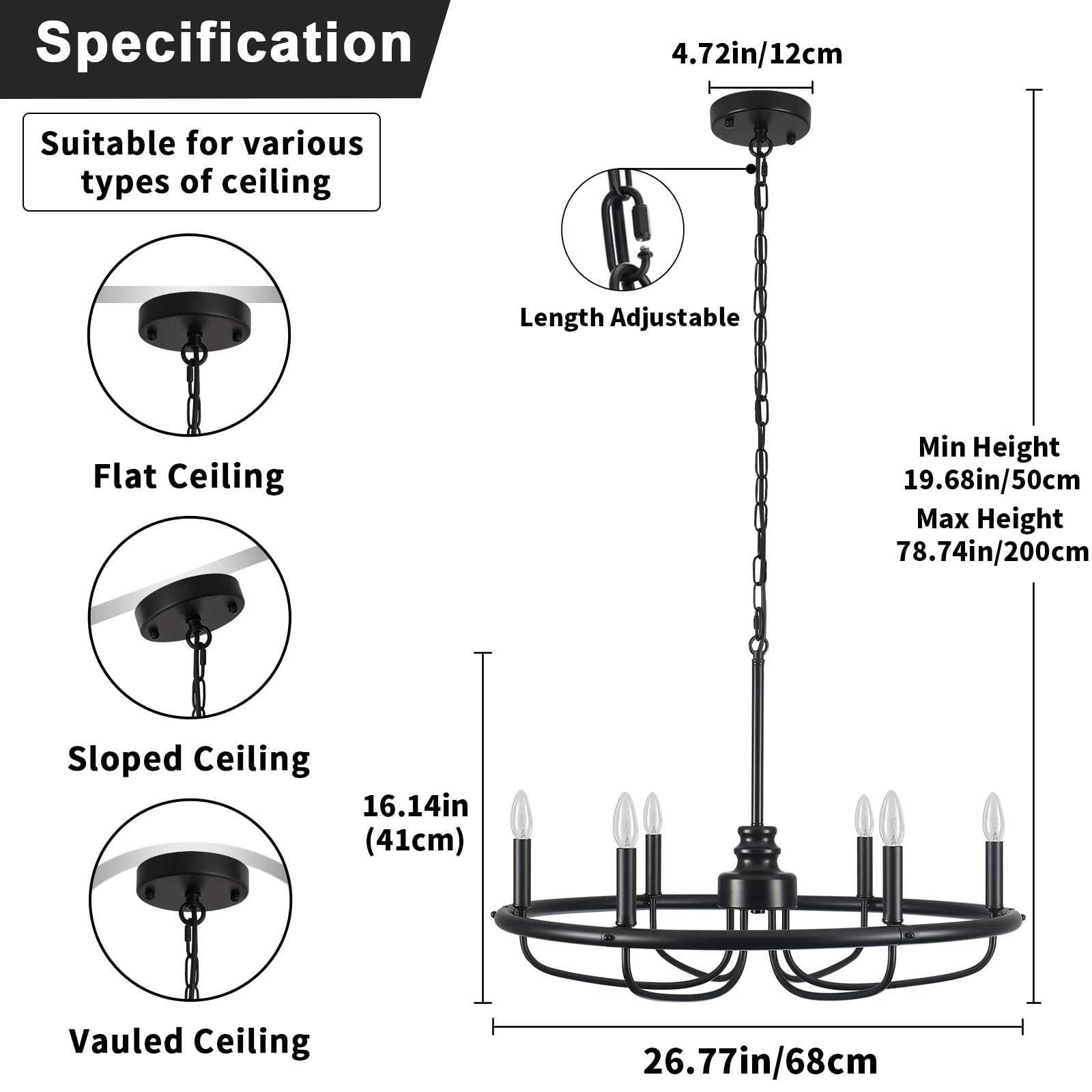 - 【Unique Design】 The modern farmhouse chandelier is designed in a rustic and industrial style, combining vintage and modern features in a candelabra design. The 6 candle stems are evenly distributed around a circle and the simple yet classic design will make your house look elegant and stunning.