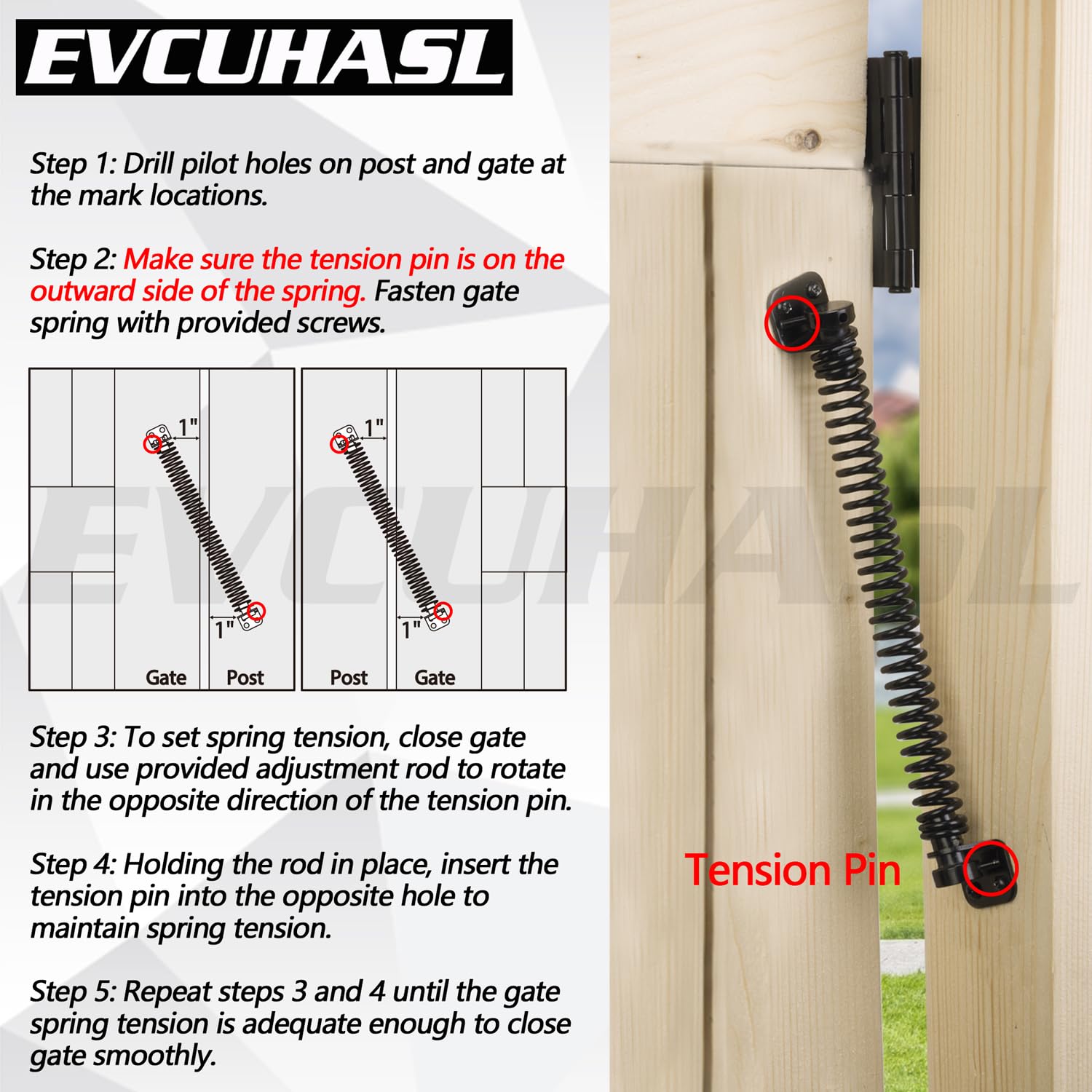 - 【Easy to Install】 Install both sides of the spring on the post and the gate respectively, and then adjust the tension of the spring to control the speed of the automatic closing. Install step by step according to the installation diagram!(Note: Make sure the tension pin is on the outward side of the spring. )