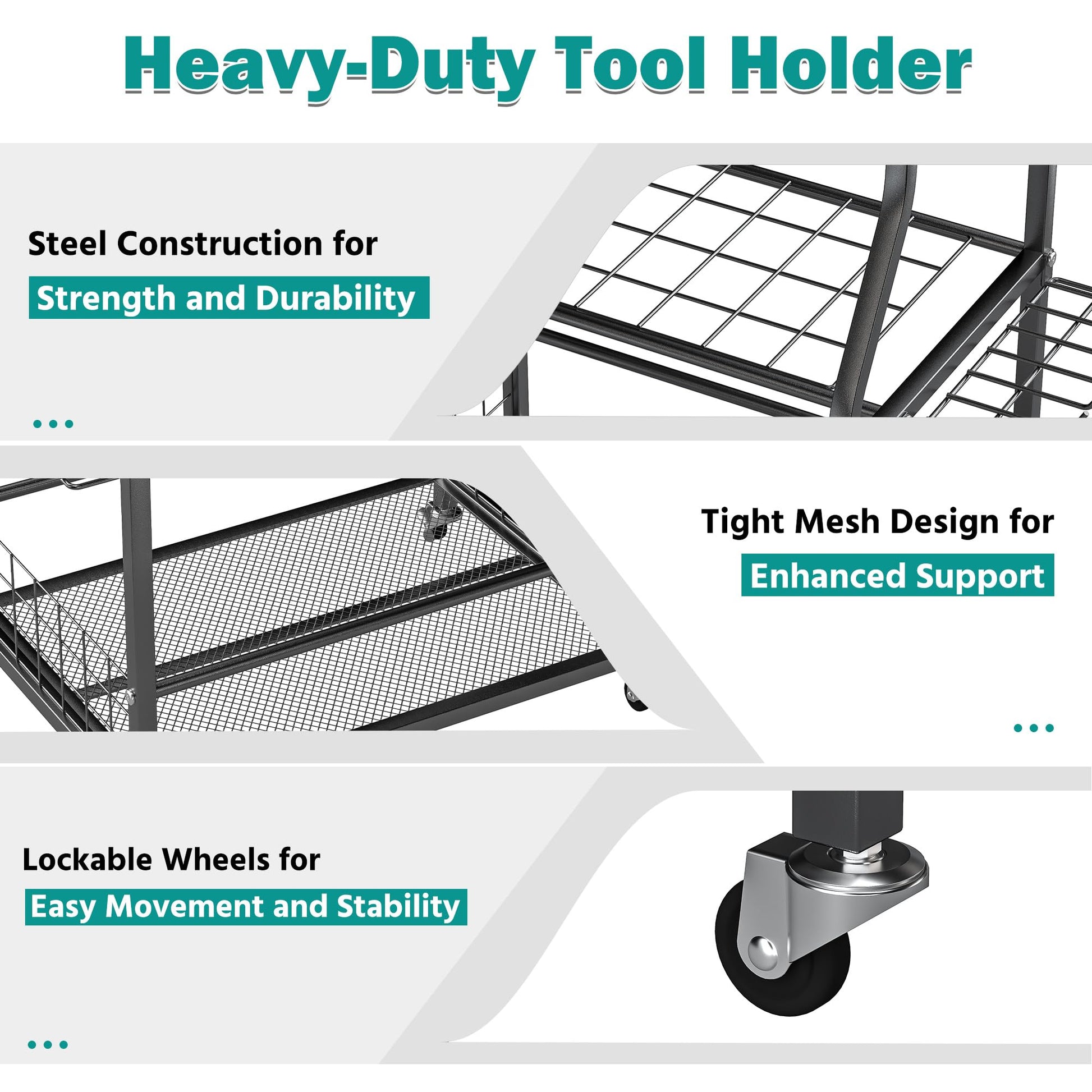 - Flexible Movement & Locking: Equipped with four heavy-duty wheels, this garden tool stand moves easily on uneven ground or grass. Two wheels feature a locking function to secure the rack in place when needed