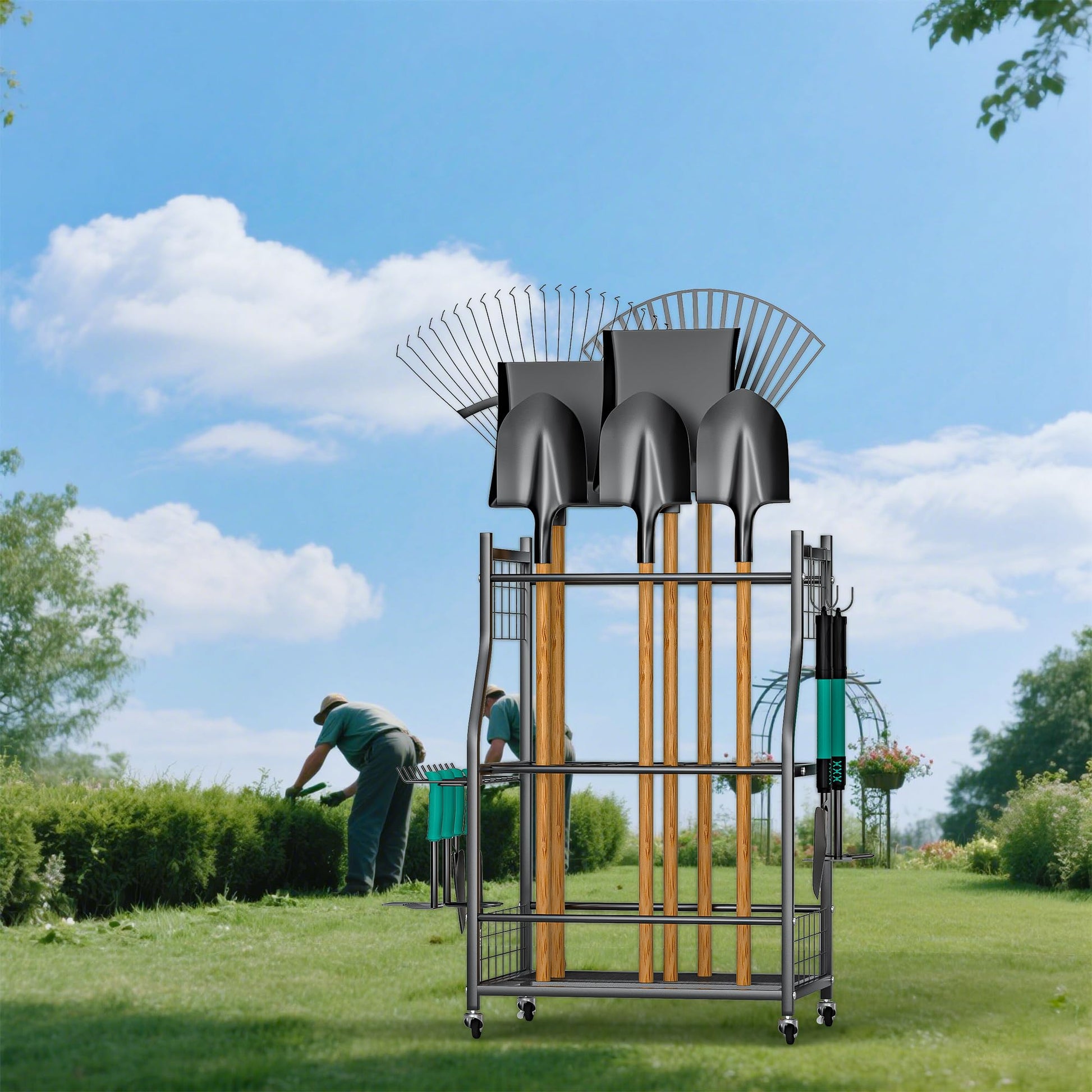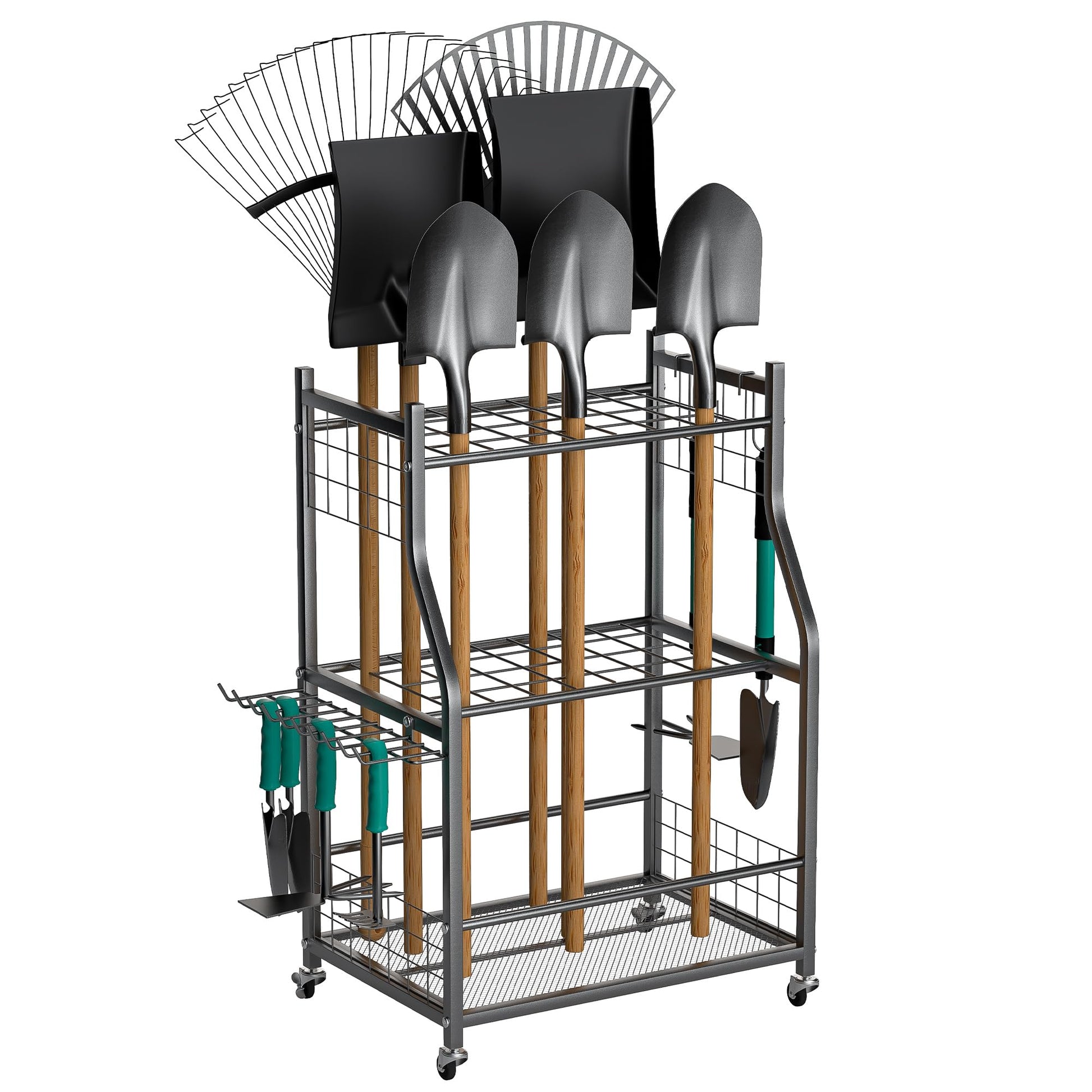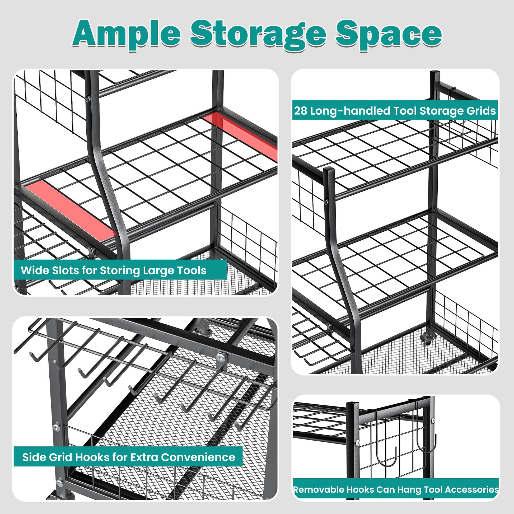 EVERHANGER Garden Tool Organizer Stand, Garage Tool Storage Organization, Yard Tool Racks with lockable wheels, Fit for Long-Handled Tools/Rakes/Brooms, Indoor/Outdoor Use
