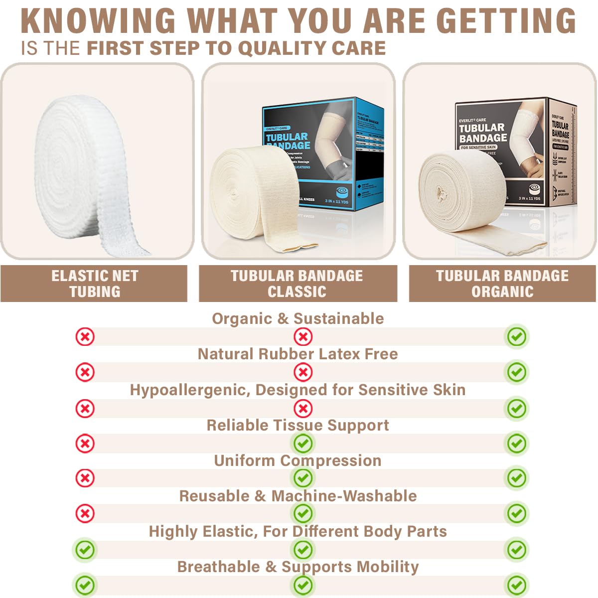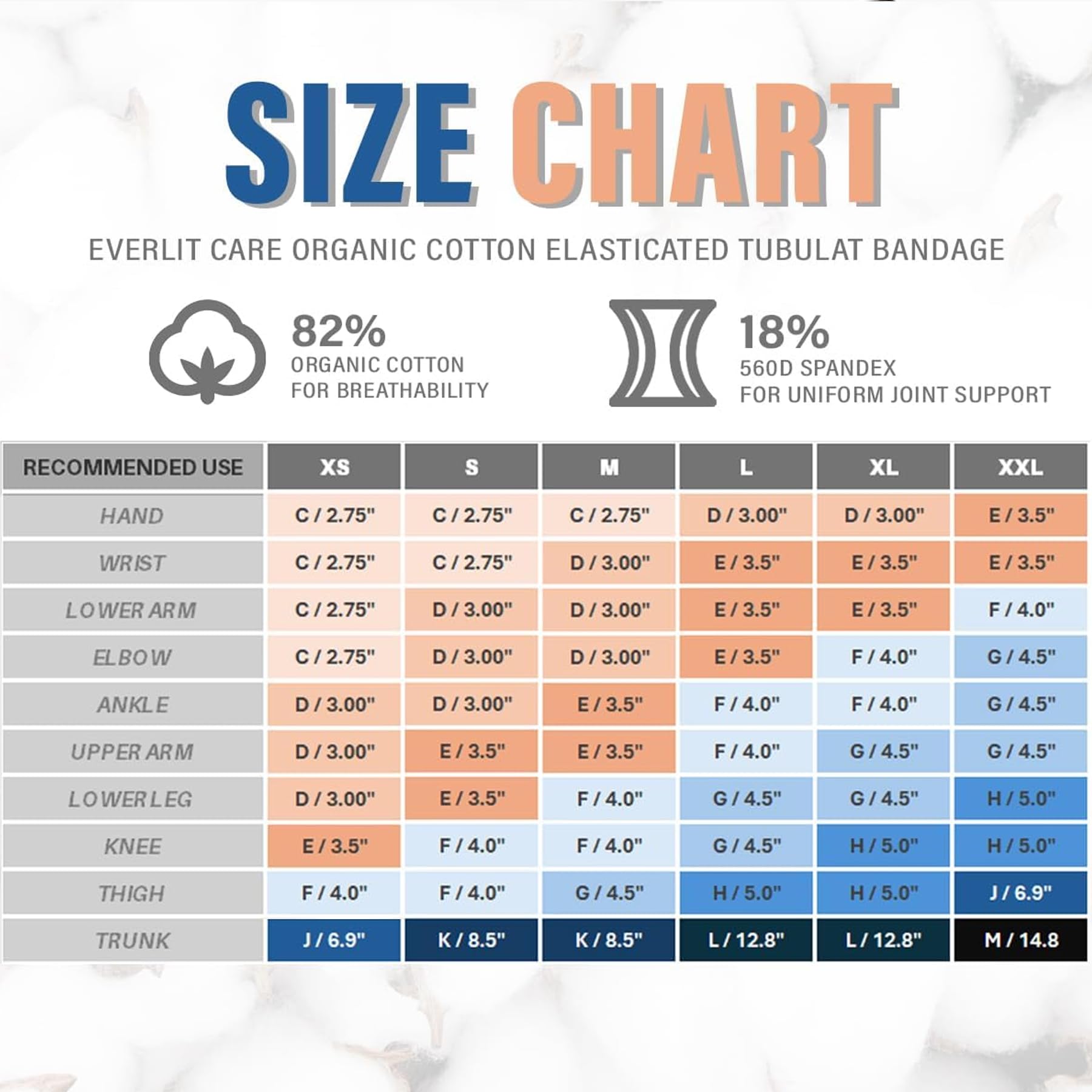 - ✅UNIFORM GENTLE COMPRESSION- The Everlit Care elasticated tubular bandage delivers reliable, gentle, consistent tissue support with a broad variety of uses. The compression bandage delivers adjustable pressure, and can be used as cotton stockinette compression bandage for sprains, strains and other injuries, as knee support/brace, cast padding, and knee wrap, or as compression bandage socks and tubing.