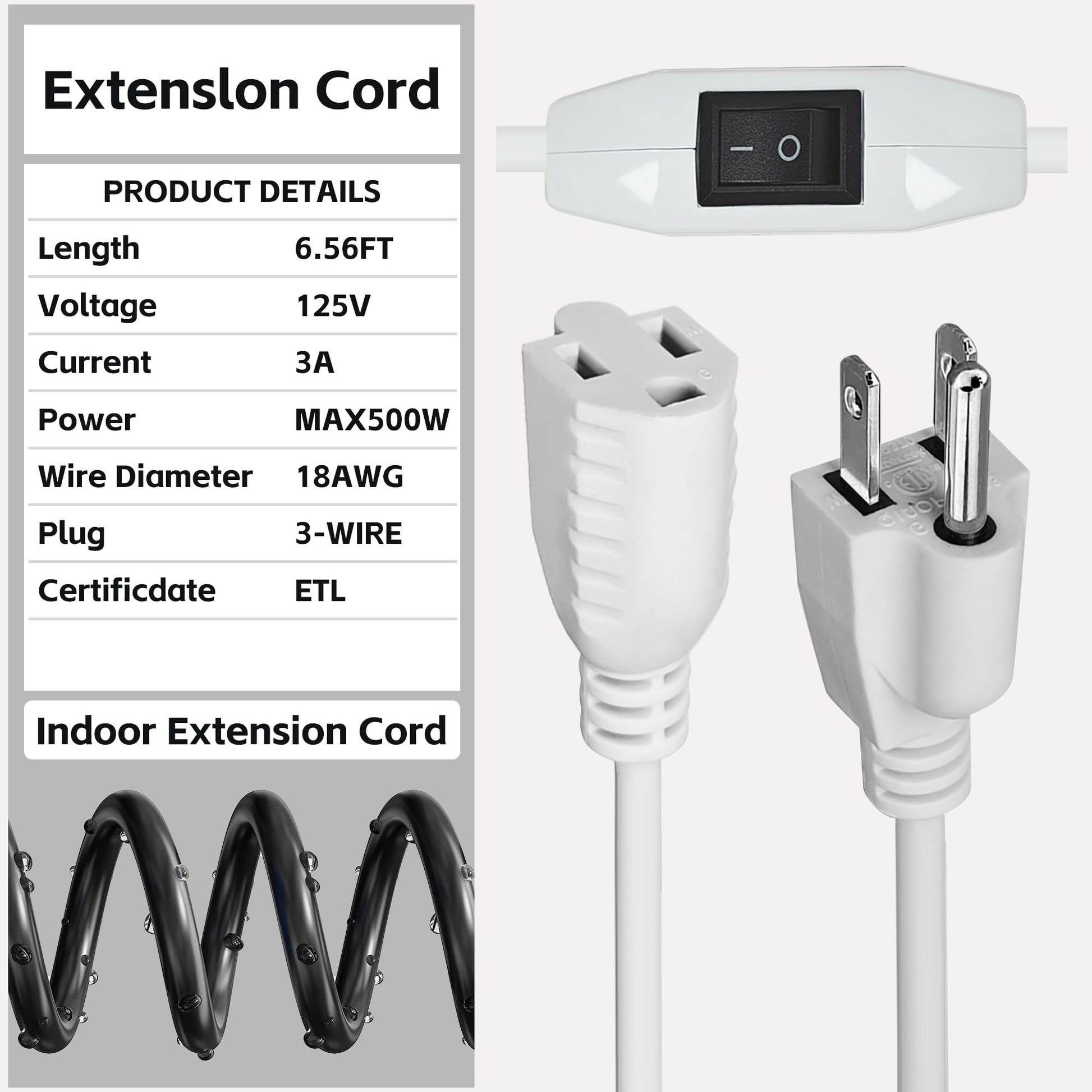 - Specification:Indoor extension cord with on off switch 6.56ft, 18 AWG, with 3 pure copper wires 125V, 3-5Amp, low power consumption. Male plug NEMA5-15P, female plug NEMA5-15R, SVT wire