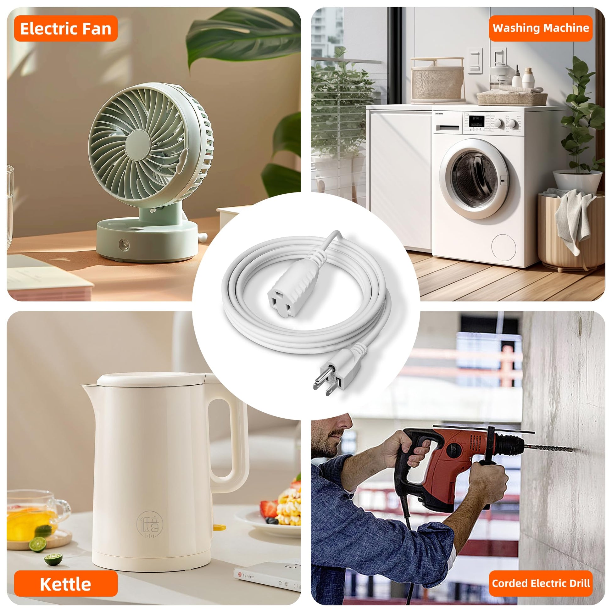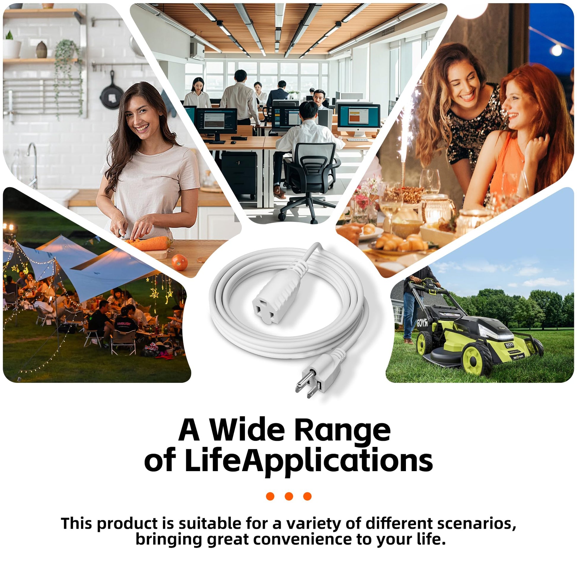 The 6.56FT extension cable can solve the distance problem between the power supply and electrical appliances, suitable for festival lights, garden lights, office computers, electric fans and indoor scenes such as home, office, workshop, party, etc., can be inserted into any standard 3-hole socket, can accept 2-hole and 3-hole equipment plugs