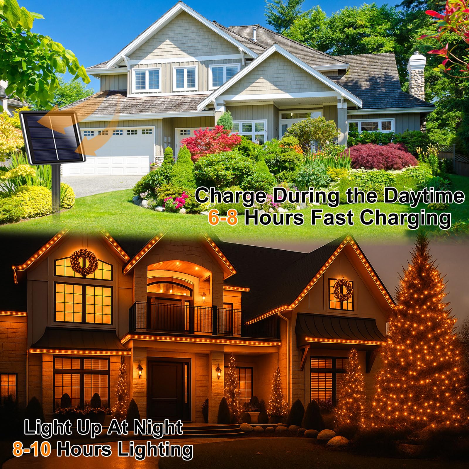 - Energy-Saving and High Efficiency: This string lights charging by solar energy, have no extra utility electric cost. String lights with built-in 1800mAH high-capacity battery can ensure long-term lighting. They can work up to 10-12 hours after being fully charged (8 hours).