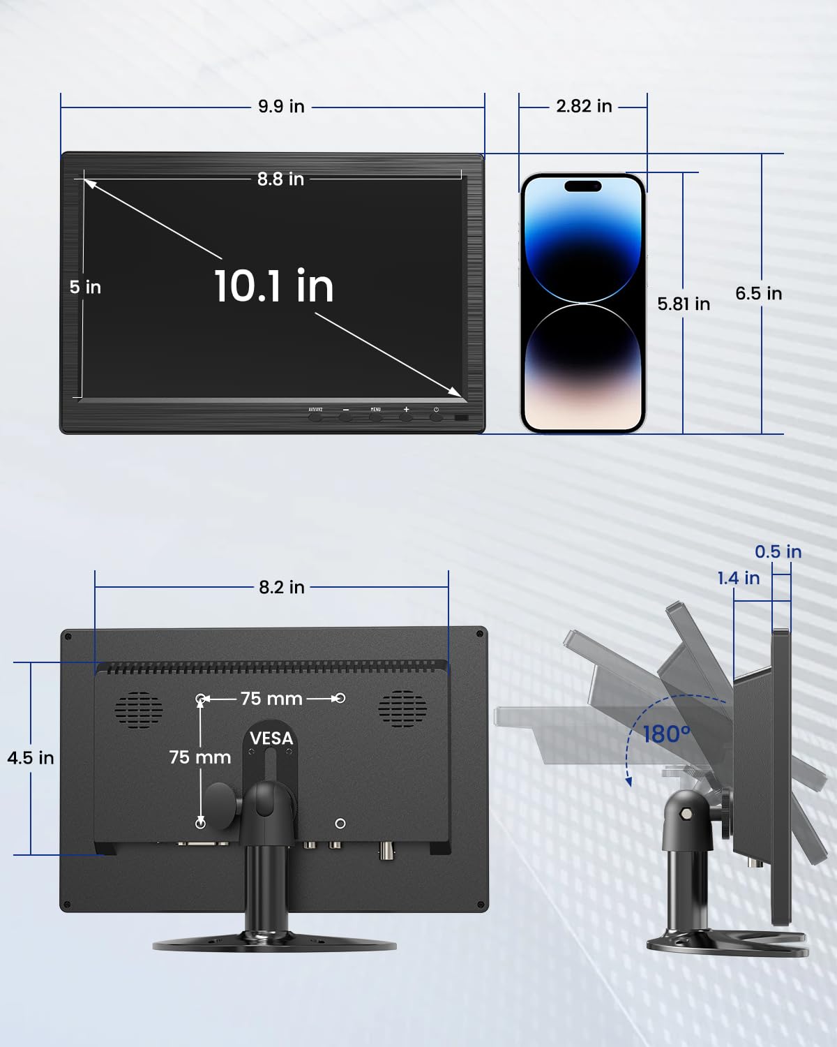 - Lightweight & Compact: 10-inch mini monitor is lightweight, with a 1366x768 resolution, 178° viewing angle, and 500:1 contrast ratio. Its portability makes it ideal for work, personal use, offices, or DIY setups, offering excellent performance wherever you go.