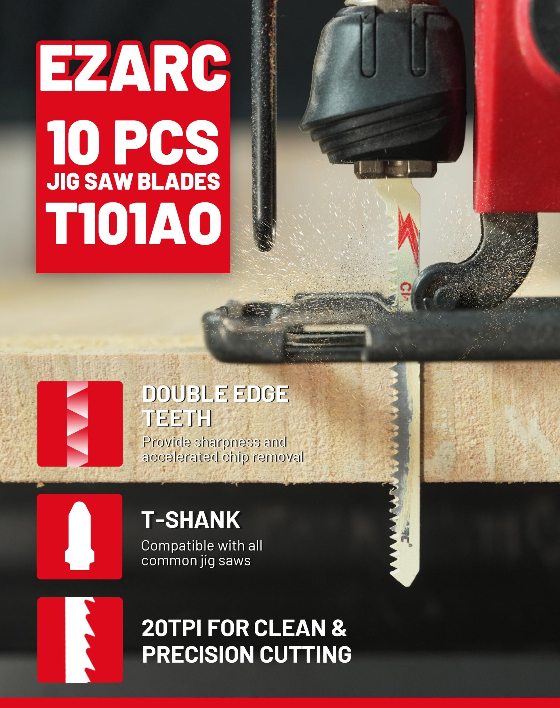 EZARC 10PCS Jigsaw Blades T101AO Jig Saw Blades Set for Wood Clean and Precision Cutting Assorted T-Shank Replacement 20 TPI Curved & Scrolling Cutting