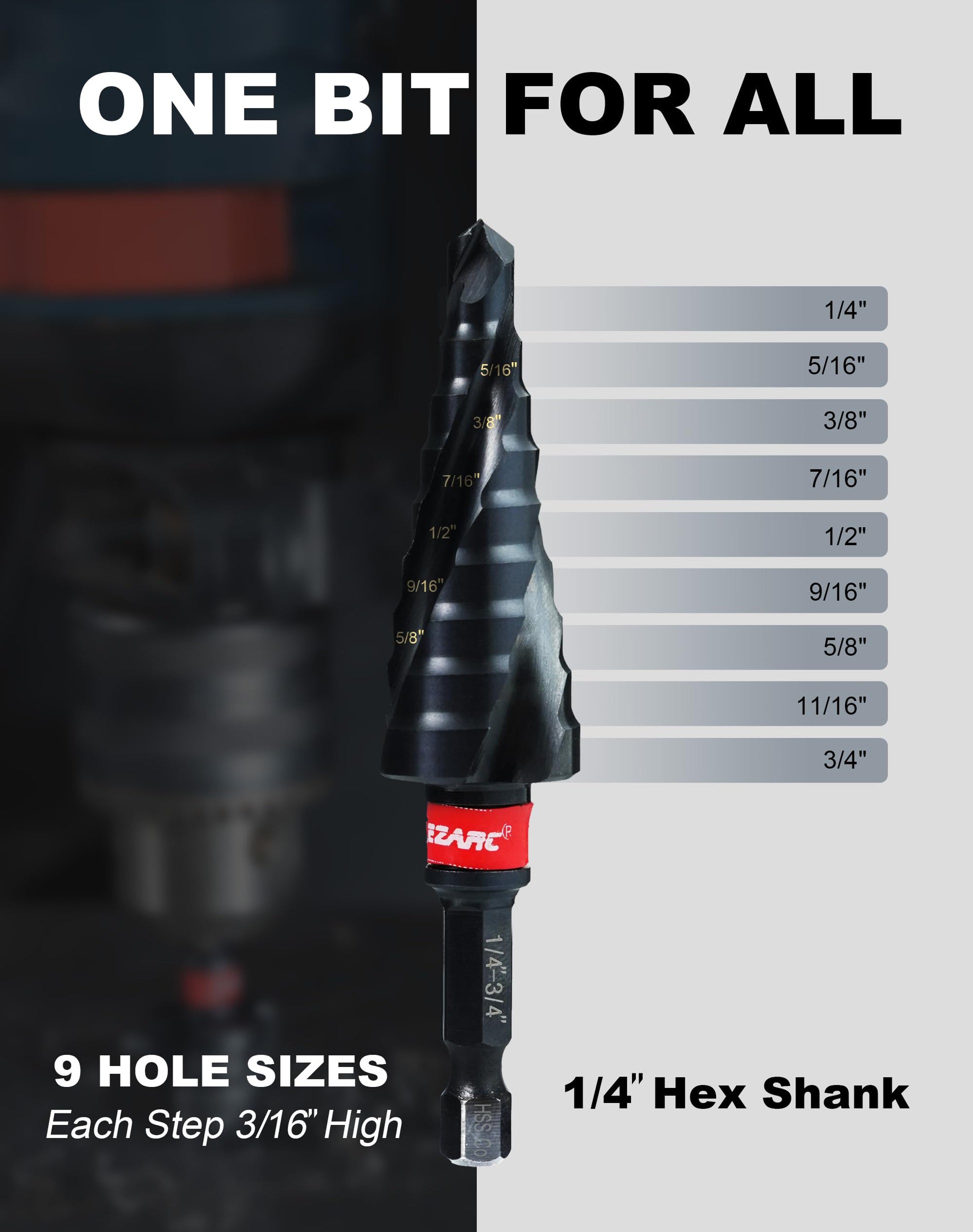 - 【Nine Step Sizes】Spiral flute design, featuring nine distinct steps, offers seamless and effective drilling across various thicknesses, eliminating the need for multiple bits. Includes 1/4", 5/16", 3/8", 7/16", 1/2", 9/16", 5/8", 11/16", 3/4"