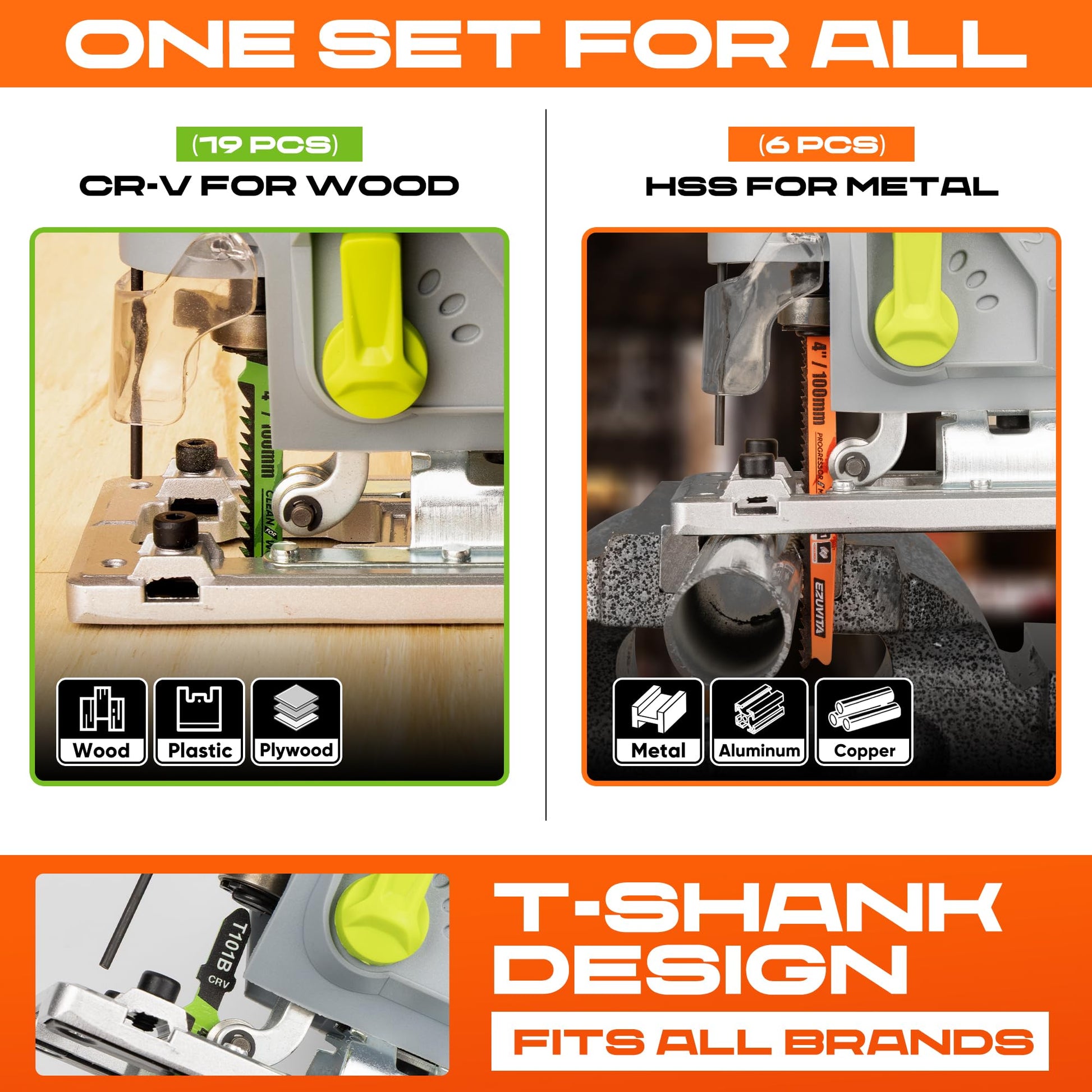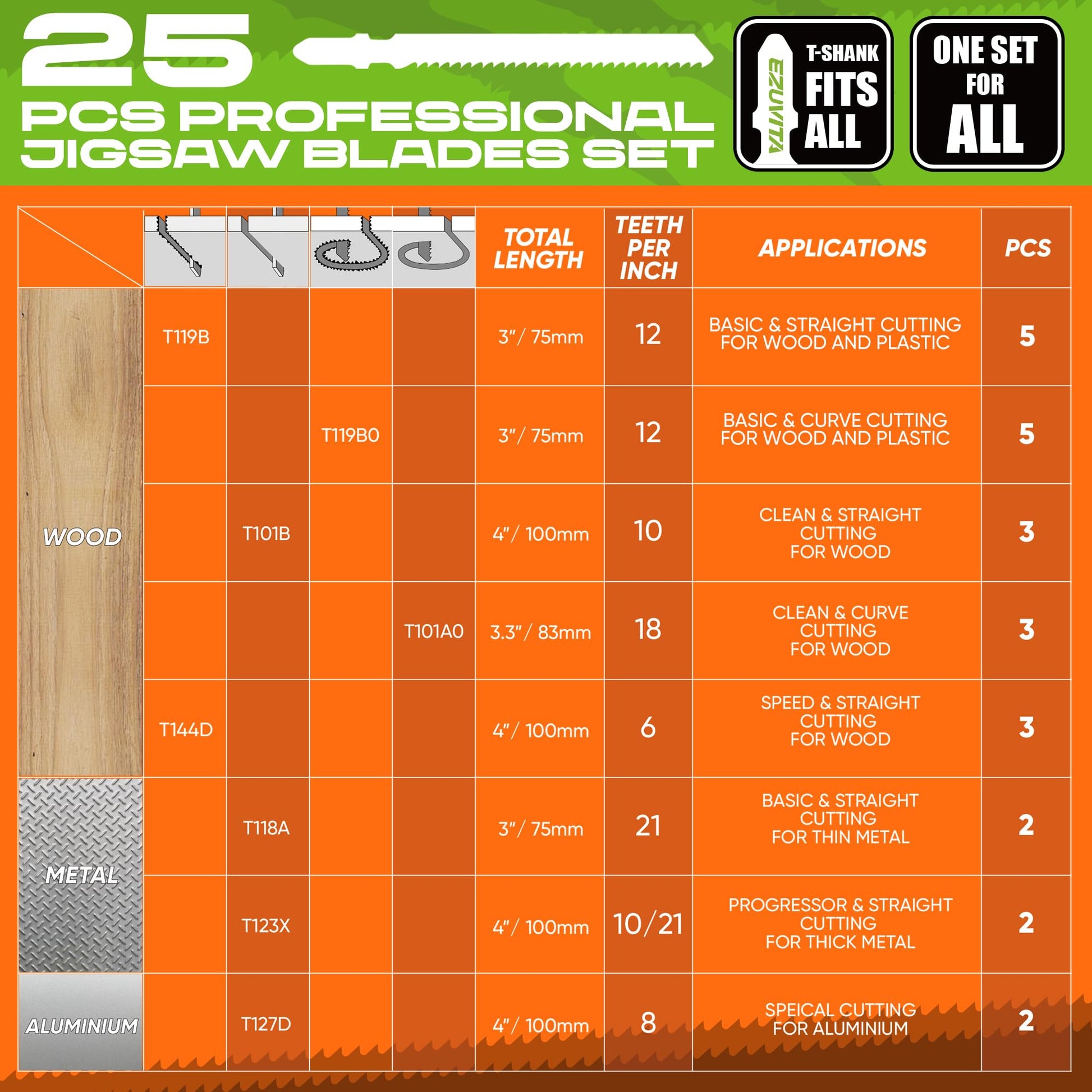EZUVITA 25-Piece Jigsaw Blades Set with Storage Case–CR-V&HSS Steel, Assorted T-Shank Replacement Jig Saw Blades for Cutting Wood, Plastic and Metal