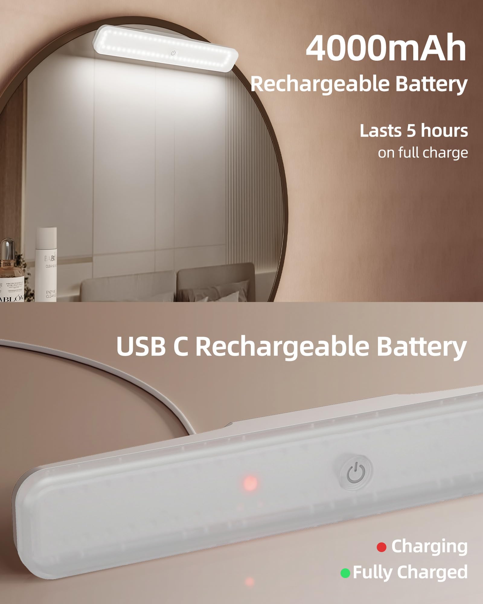 - USB Rechargeable Design: This wireless vanity light comes with a 4000mAh rechargeable battery, eliminating messy cords. The indicator light turns red while charging, and switches to green when fully charged—providing up to 5 hours of continuous use