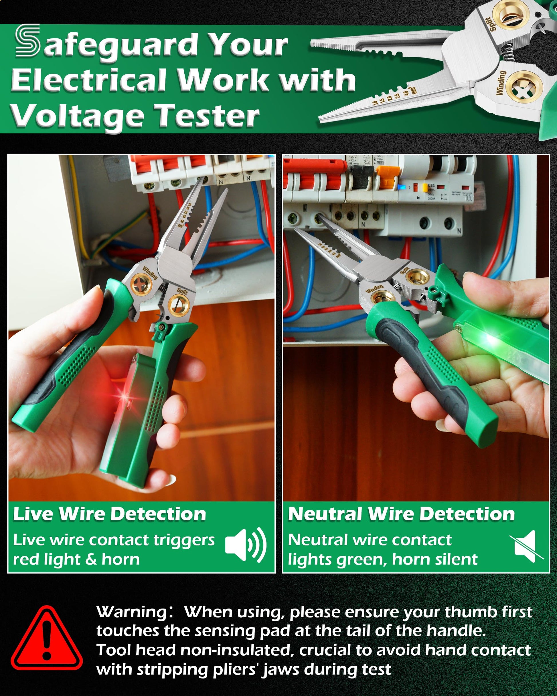 - The 8-in-1 Wire Stripper Pliers with Voltage Test Capability Provides Convenience and Precision for Electrical Tasks. Bid Farewell to Cluttered Toolboxes with This Comprehensive Solution. Suitable for AWG Sizes 18, 14, 12, 10, 6/1.0, 1.5, 2.0, 2.5, and 4.0mm², as Well as Cape Cable 25mm², Capable of Opening Cable Jackets and Separating 2*1.5mm² Wiring.