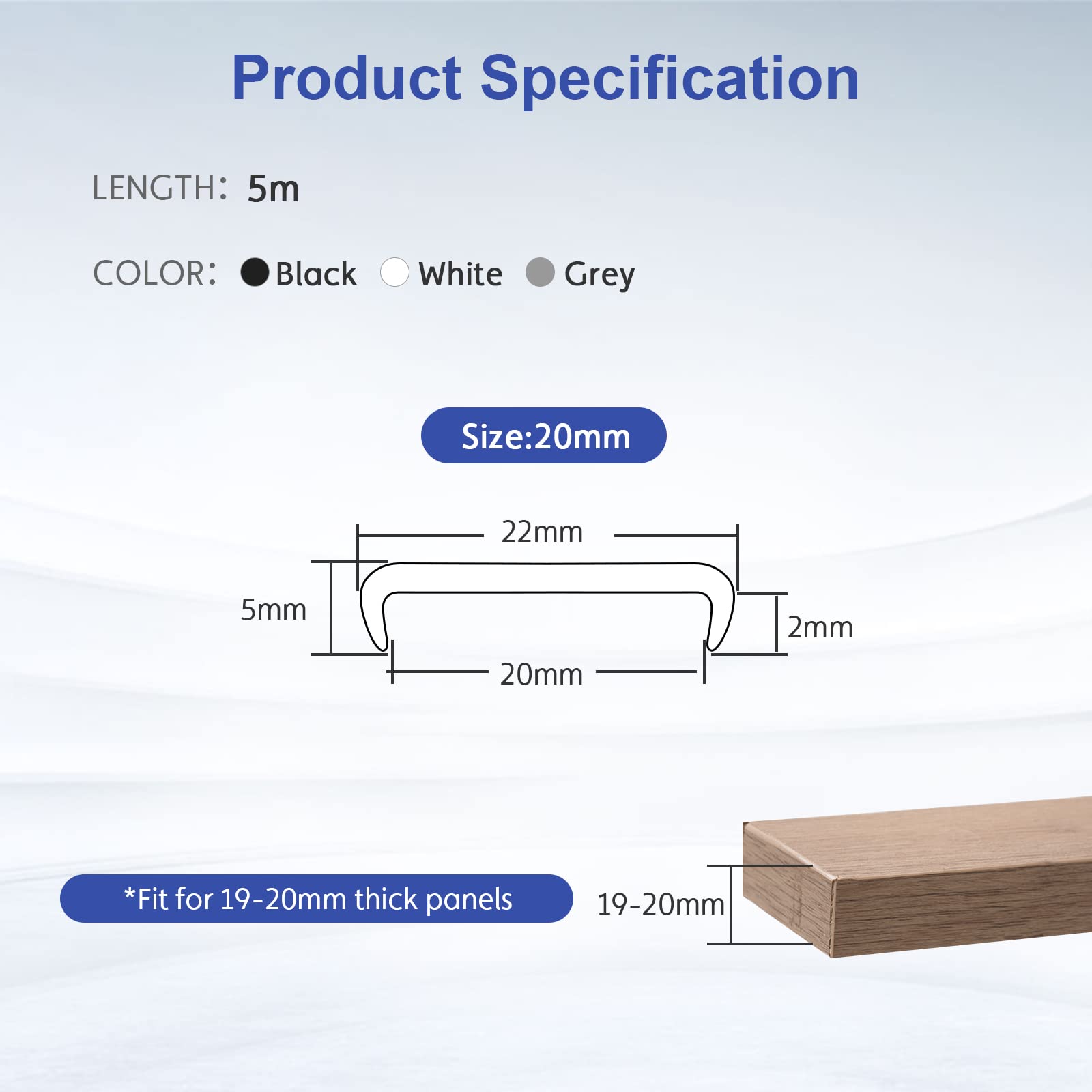 - COLOR & SIZE - Edge banding is 5m (16.4ft) long, with available widths including 9mm, 12mm, 15mm, 16mm, 18mm, 20mm (3/4''), 25mm (1''), 30mm, 36mm, and 40mm. Colors include white, black, grey, etc. It is thickness of 2mm. The edge banding can still be used normally even if there is a 1mm difference in width. Please measure the height of the furniture edge before ordering