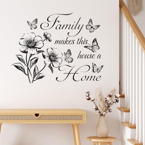 Family Makes This House a Home - Wall Quote Decals with Floral & Butterfly, Inspirational Quote Wall Stickers for Living Room, Bedroom, Glass Window, Removable Vinyl Decor