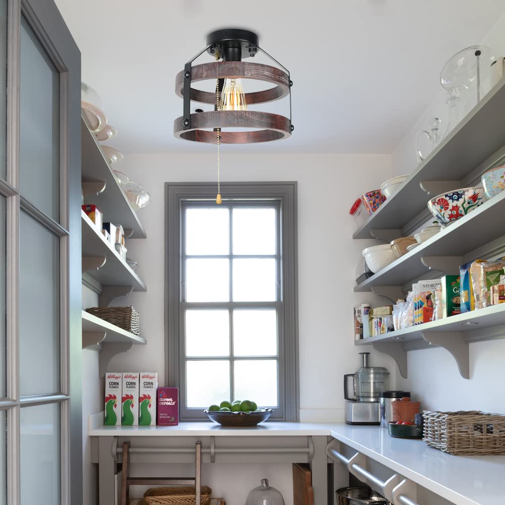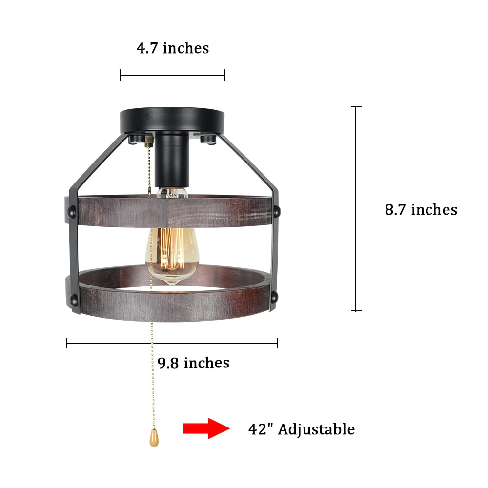 Farmhouse Flush Mount Ceiling Light with Pull Chain, 1-Light Small Wood Rustic Close to Ceiling Light Fixture Pull String Country Home Lighting Edison E26 8060PC