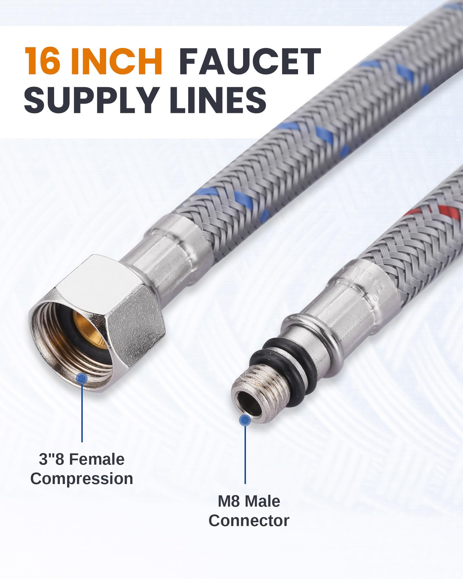 - 【Universal Faucet Hose】Feature 3/8” Female compression and M8 Male Connector. Compatible with most Standard Size faucets.Supply for hot & cold water.