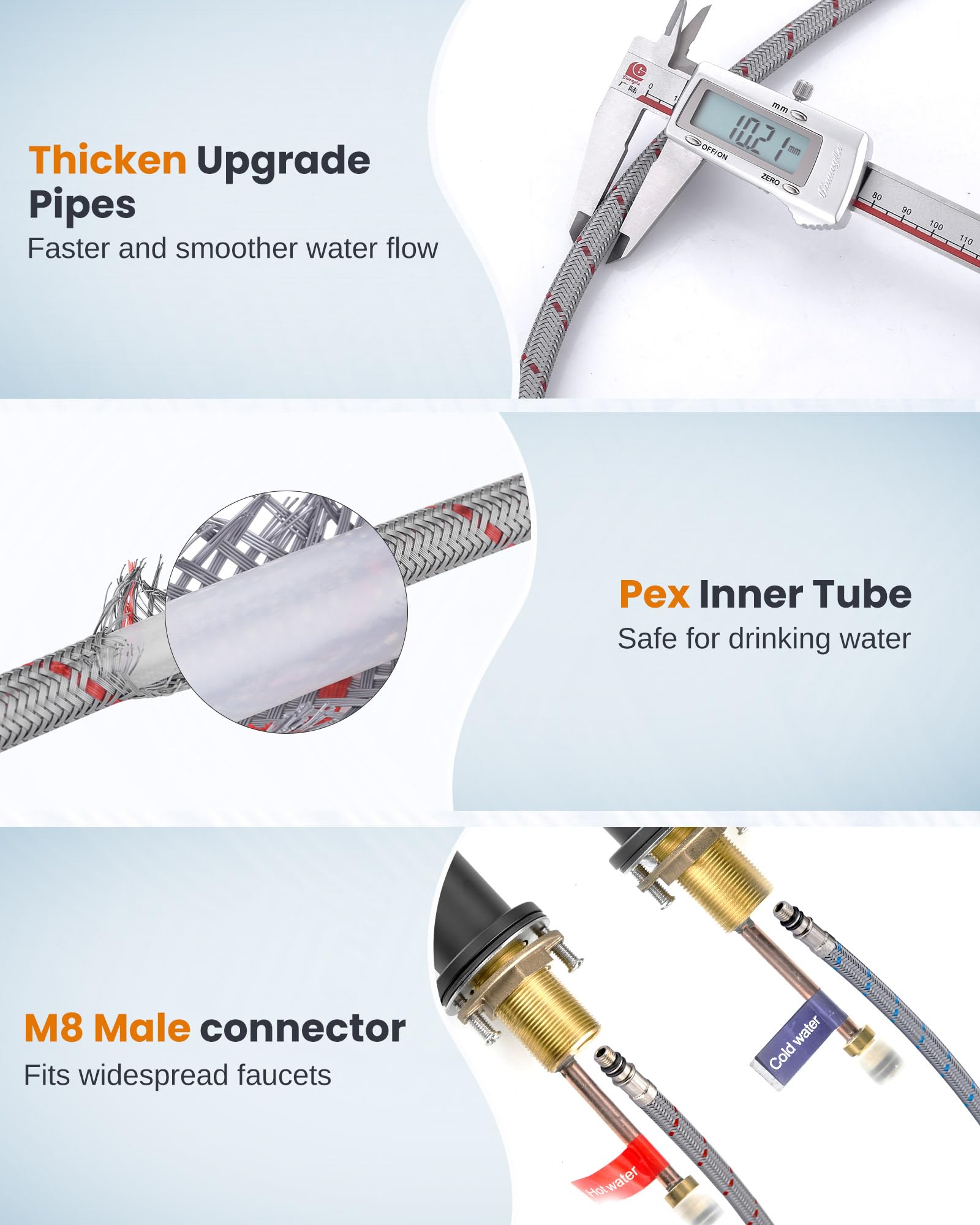 - 【TIPS ! 】Feature 3/8”Female compression and M8 x 1mm Male Connector(Not the M10 x 1mm male connector). Supply for hot & cold water. To avoid wasting your time, please double check the size of your faucet before placing an order to see if your faucet will fit the M8 connector(Approx0.31"(8mm)to Faucet).