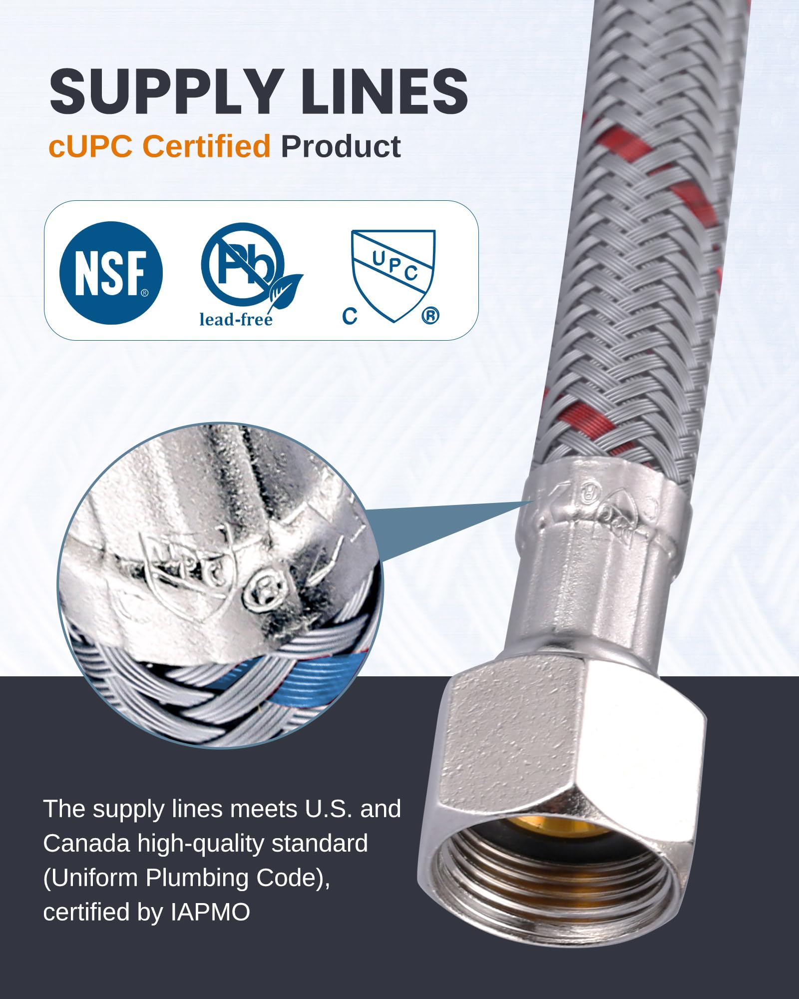 - 【cUPC Certified】 The faucet supply lines are cUPC Certified and safe for water usage.16 inch in length,suitable for commercial or residential sink,bathroom,toilet indoor/outdoor sink faucets,water heater etc.