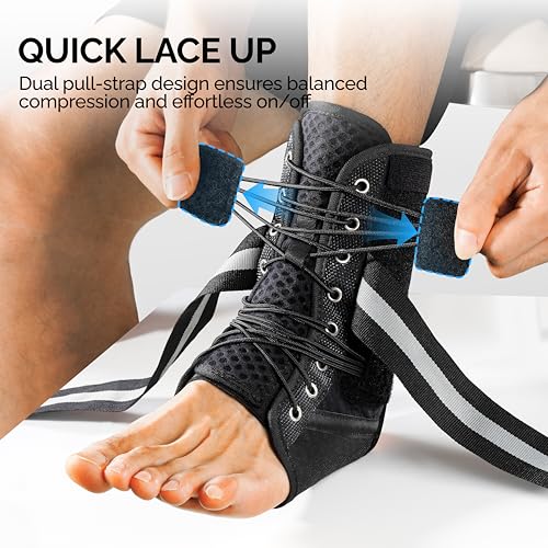 - Easy On & Off: Innovative dual-side pull straps of the ankle support brace deliver balanced compression and make wearing and removal quick and effortless, even with swollen or injured ankles. Slim, shoe-compatible design allows comfortable wear inside sneakers or daily footwear, avoiding bulk while ensuring continuous support