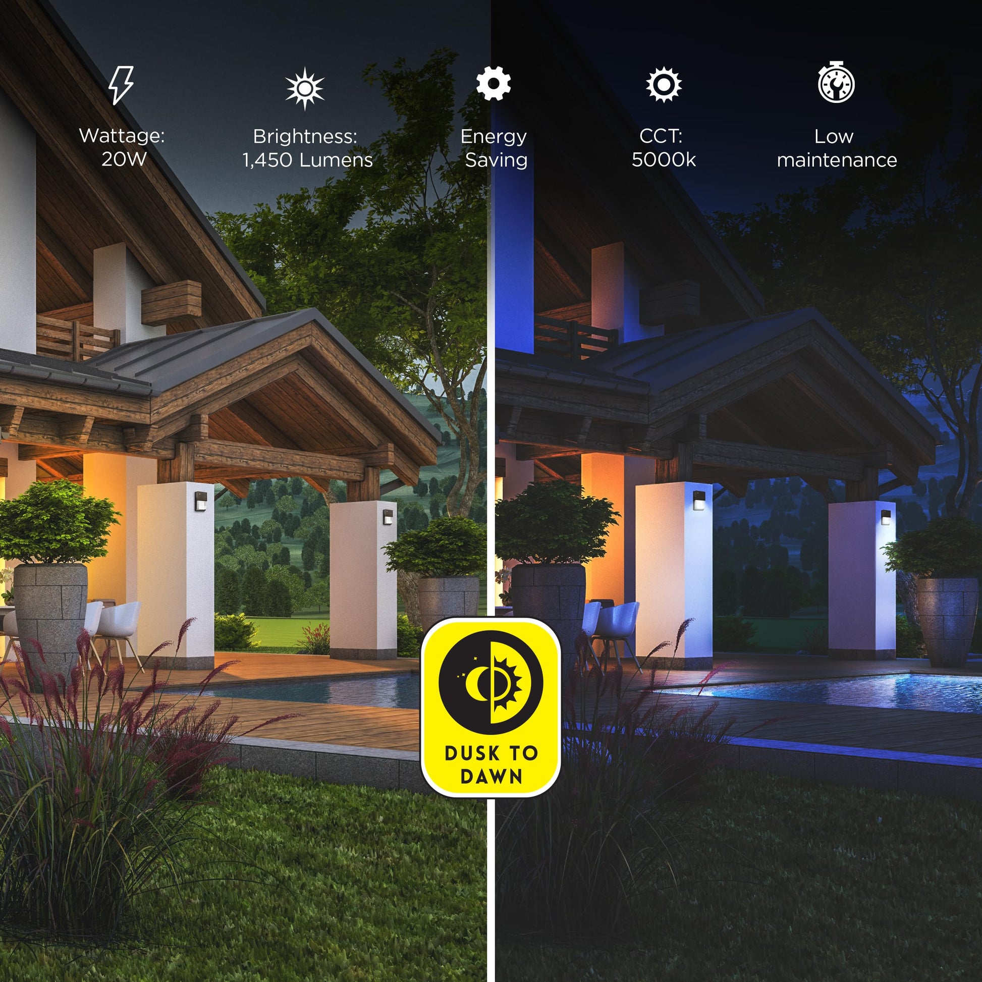 - Wall or eave-mountable, this light illuminates doors, backyards, or parking areas with super-bright 1,450 lumens while using less than 21 watts