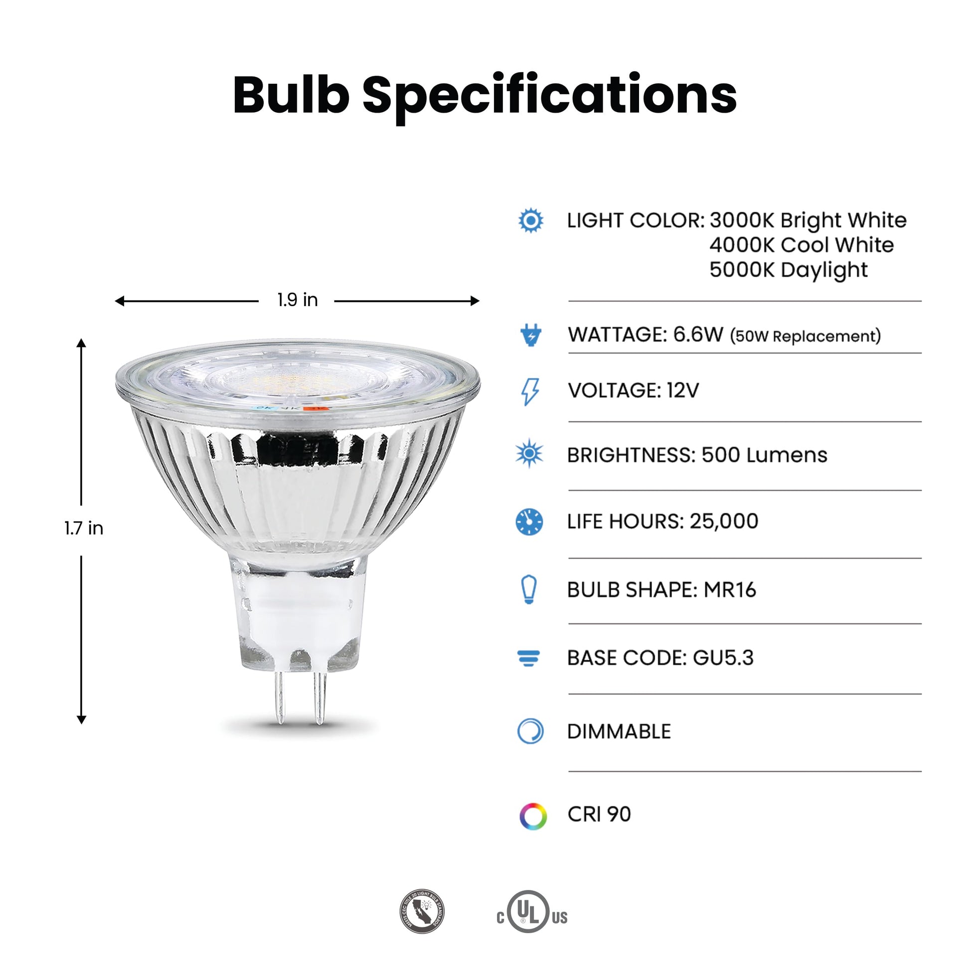 Details: Feit Electric 50-watt equivalent traditional glass MR16 flood LED light bulbs feature adjustable white light to match your current lighting or set the perfect mood in any room. They offer bright white, cool white, and daylight color light with the flip of a switch. With their high color rendering index rating, these Enhanced LEDs are our highest quality energy-efficient lights. 90+ CRI provides bolder color rendering and enhanced contrast so people and objects appear more realistic and vibrant. These GU5.3 base MR16 reflectors produce a similar light output using less energy than standard 50-watt incandescent light bulbs. They are fully dimmable, with an average life of 25,000 hours/22.8 years, and are safe for indoor or outside use. Choose dependable, high-quality Feit Electric 12-volt MR16 bulbs for residential or commercial applications.