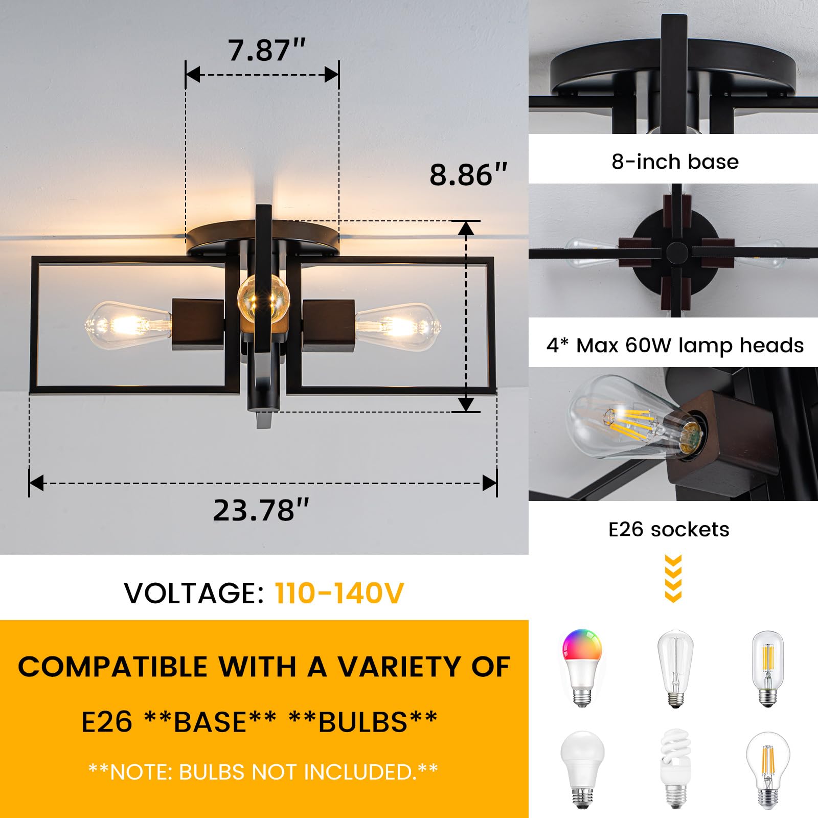 - [4-Light Close to Ceiling Light]The modern light fixtures ceiling supports any E26 base bulbs (max 60W each); Our bathroom ceiling light is dimmable when used with compatible dimmable bulbs (bulbs and dimmer not included)