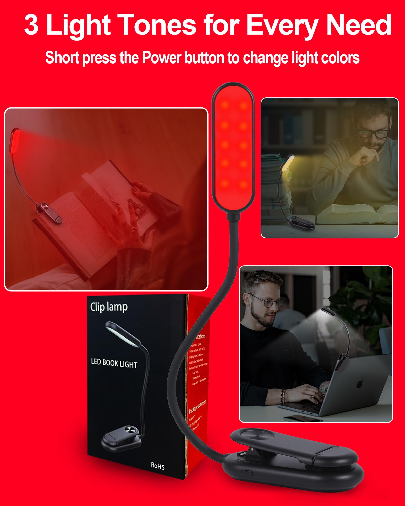 - Ultra-Long Lasting Portable Clip-On Rechargeable Book Light: Enjoy 50+ hours in red mode! Features USB-C charging for your rechargeable book light. The book light clip on design with 360° flexible neck and ultra-lightweight (2.6oz) design make it perfect for travel, camping, or bedside reading