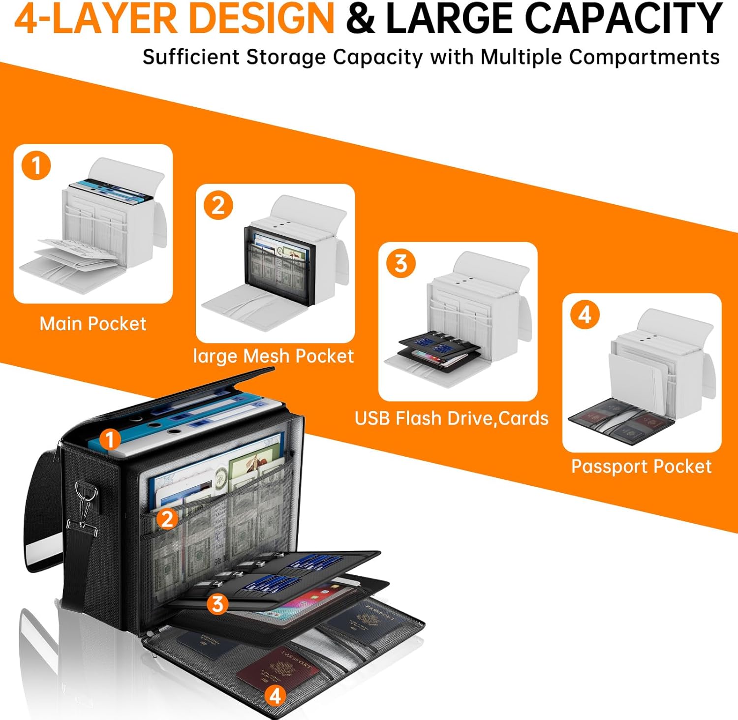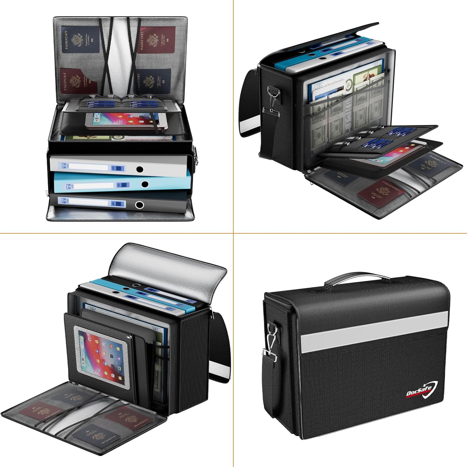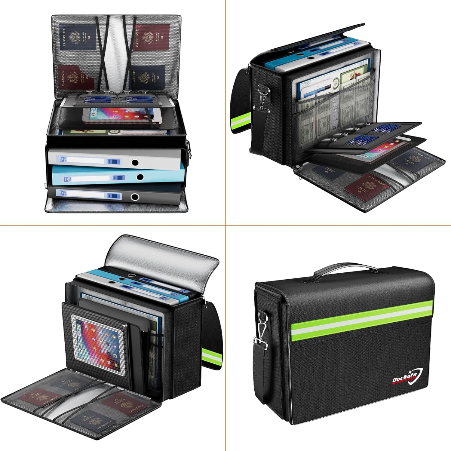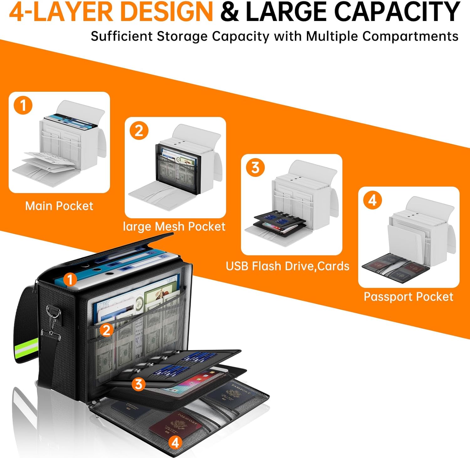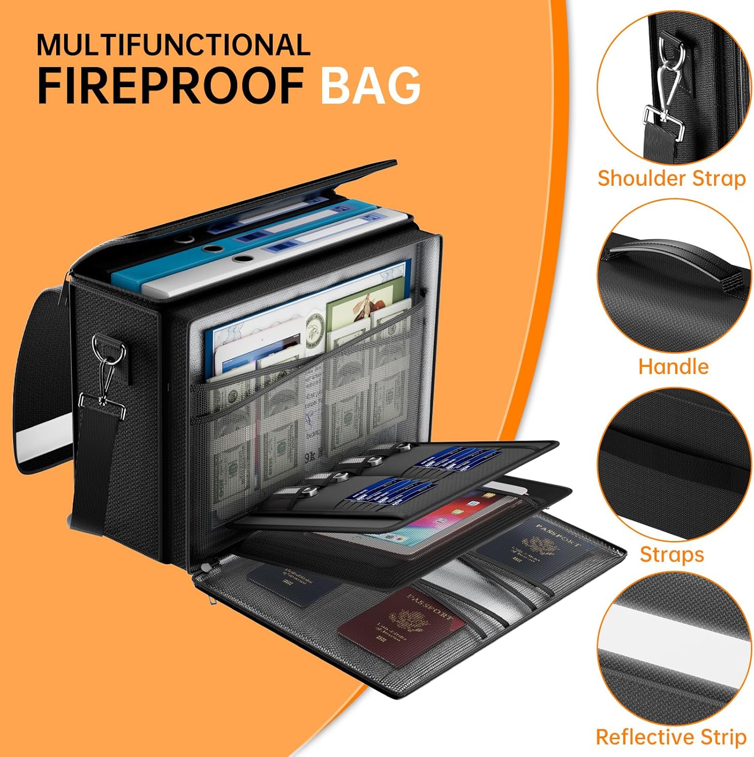 - Multi-Compartment Storage: The newly designed secondary pockets includes 4 passport mesh bags, 16 card slots, 4 U Disk pockets, 7 folder layers. Fireproof document bag with lockable double zipper opening-Easy Access, Wide Opening. The reflective strip design on the side of the bag allows you to immediately find your fireproof bag even at night, protecting irreplaceable documents and valuables from fire