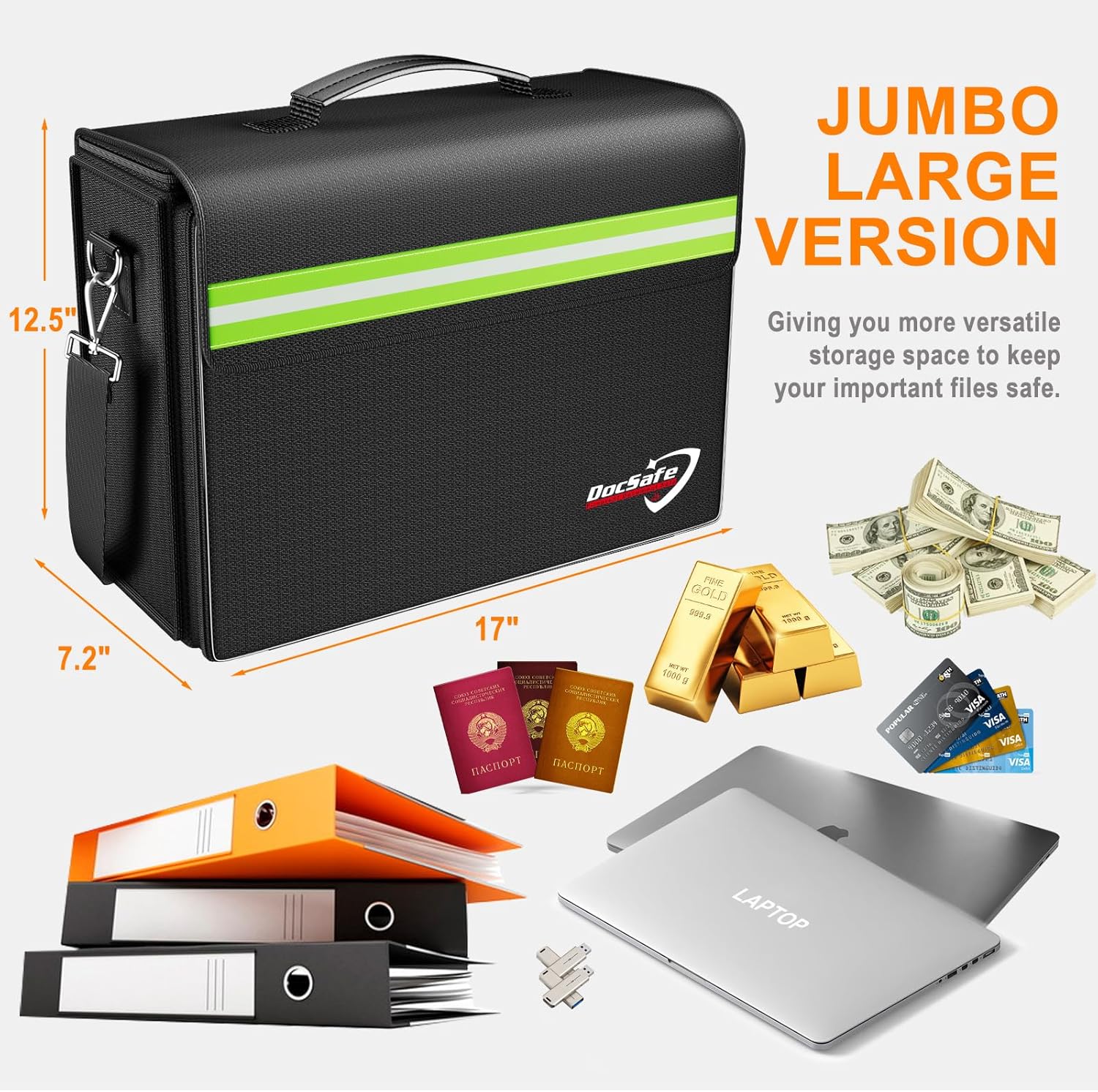 - Fireproof and Water-resistant : DocSafe Large Fireproof Document Bag is made of silicone coated material and aluminum foil which withstand the temperature up to 5200℉(double safe protection).Aluminum foil lining isn’t easily melt under high temperature after several tests. It has been passed by SGS TEST(UL94 VTM-0 Certified).The bag is fireproof&Water-resistant, which can effectively protect your important documents in a fire,flood,and wet weather. They will further keep your files intact