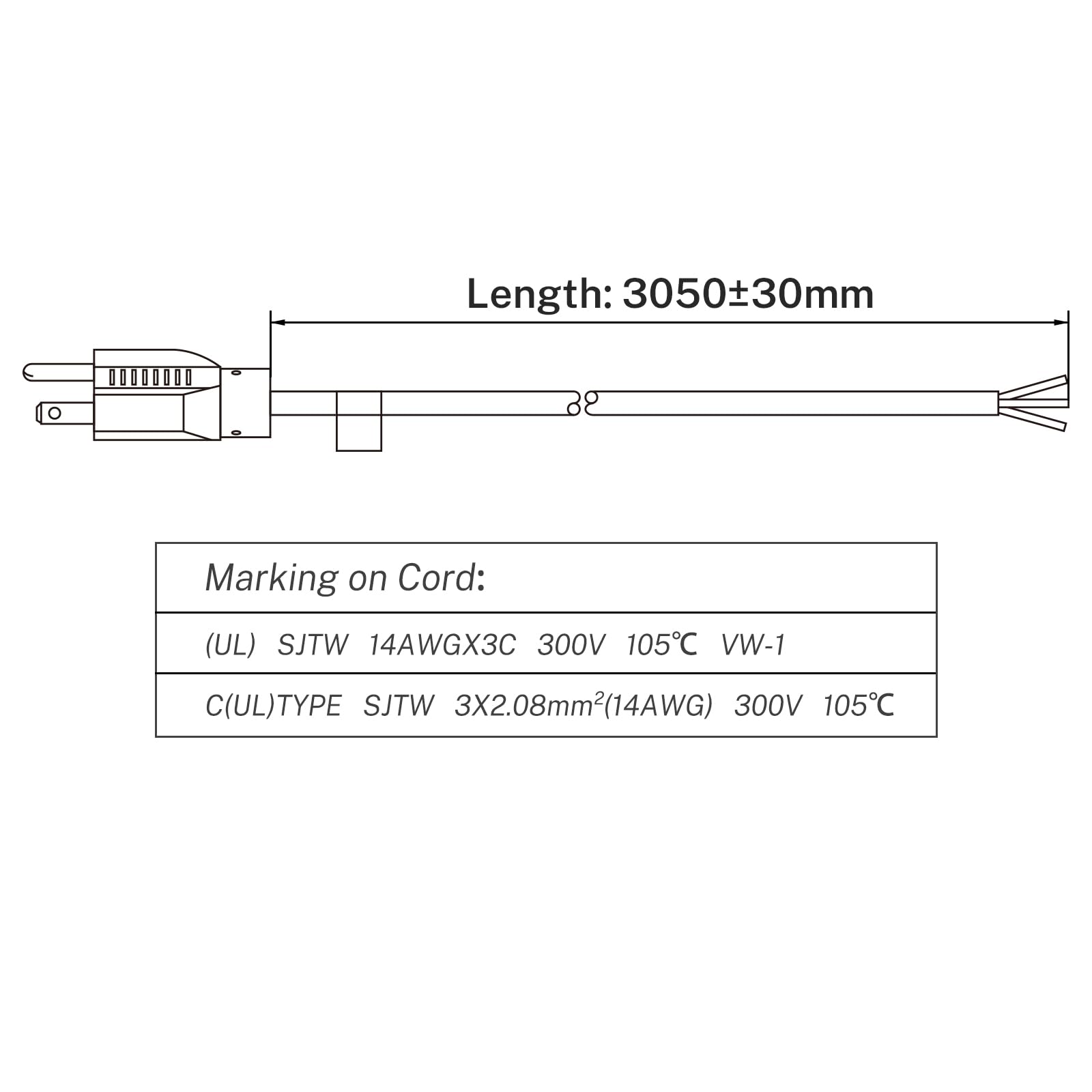 - 10 feet, 14/3 replacement power cord, SJTW, 300V, VW-1, 105℃