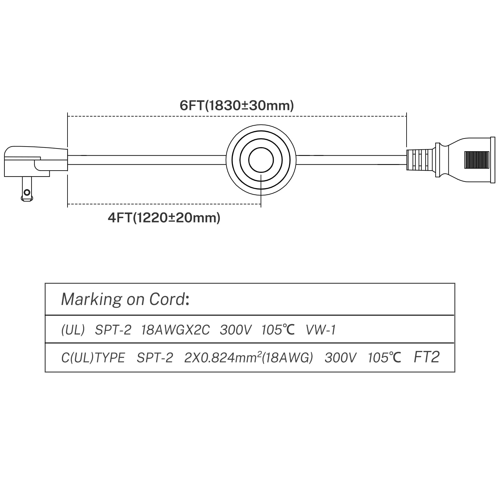 - Switch Design: 6 feet extension cord with a footswitch located 4 feet(±0.06ft) from the male plug and 2 feet (±0.06ft) from the female socket
