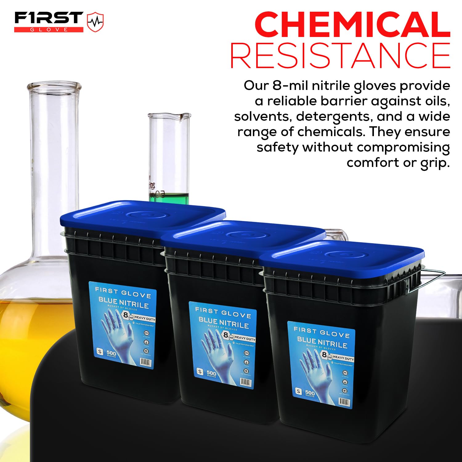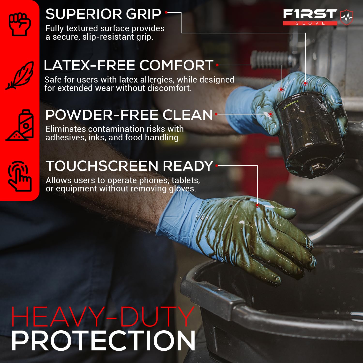 First Glove Nitrile 8 Mil Bucket Fully Textured Blue Gloves - Heavy Duty Gloves for Industrial Automotive, Food, Janitorial & Work - Glove with Diamond Grip & Powder-Free - 500 Count Large