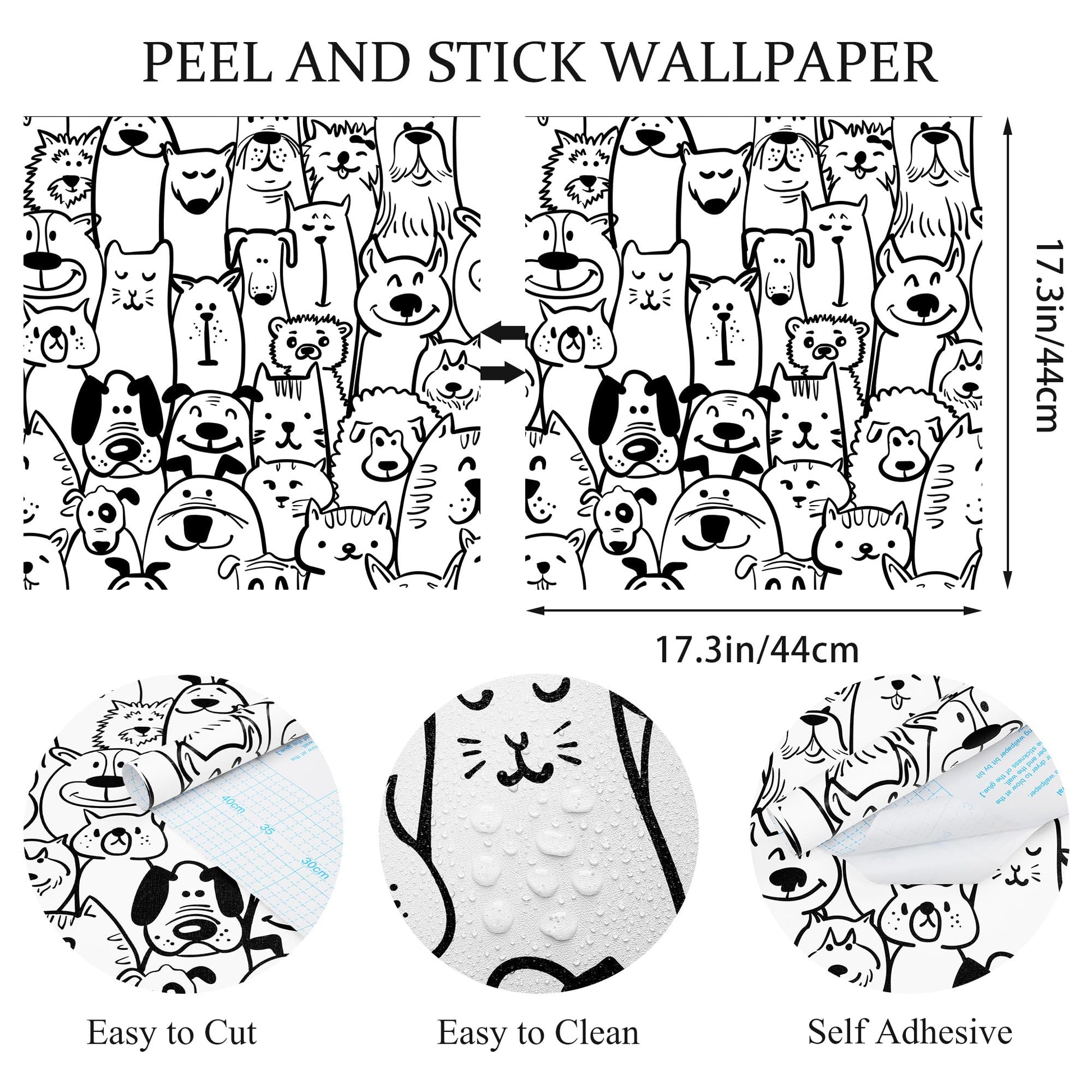 Fiula Peel and Stick Wallpaper Contact Paper Black and White Wallpaper Modern Dog Animal Wall Paper Textured Self Adhesive Removable Wallpaper for Nursery Kids Room Shelf Liner Vinyl Roll 78.7"x17.3"