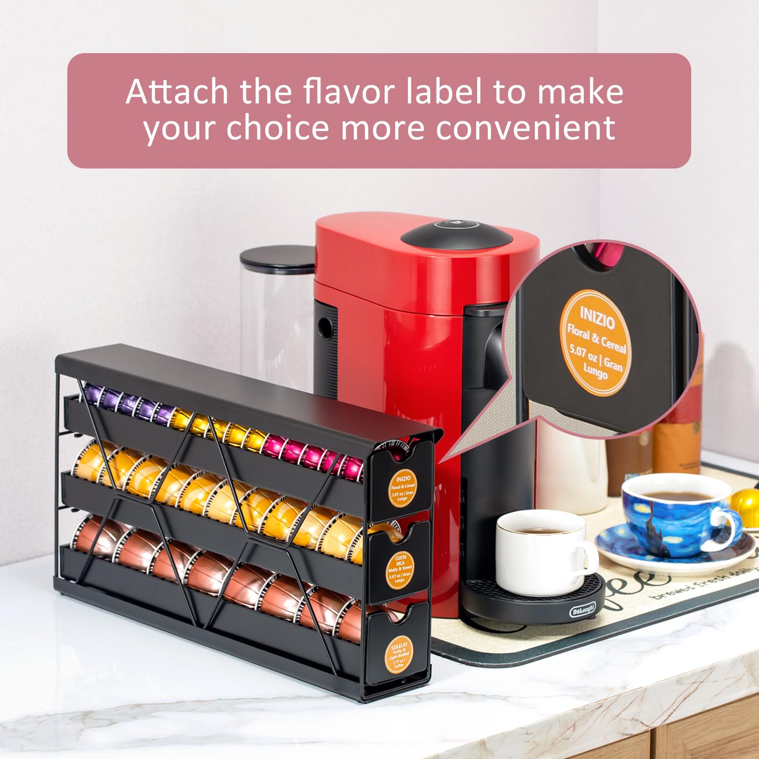 - 【Coffee Lover's Hack】Secret weapon alert: The included flavor tags stick to drawer panel for at-a-glance selection. Fits all size vertuo pods: 3-tier holds (48 pods 1.35oz)(33 pods 7.77oz)(24 pods 12oz) . Your kitchen called – it wants this.