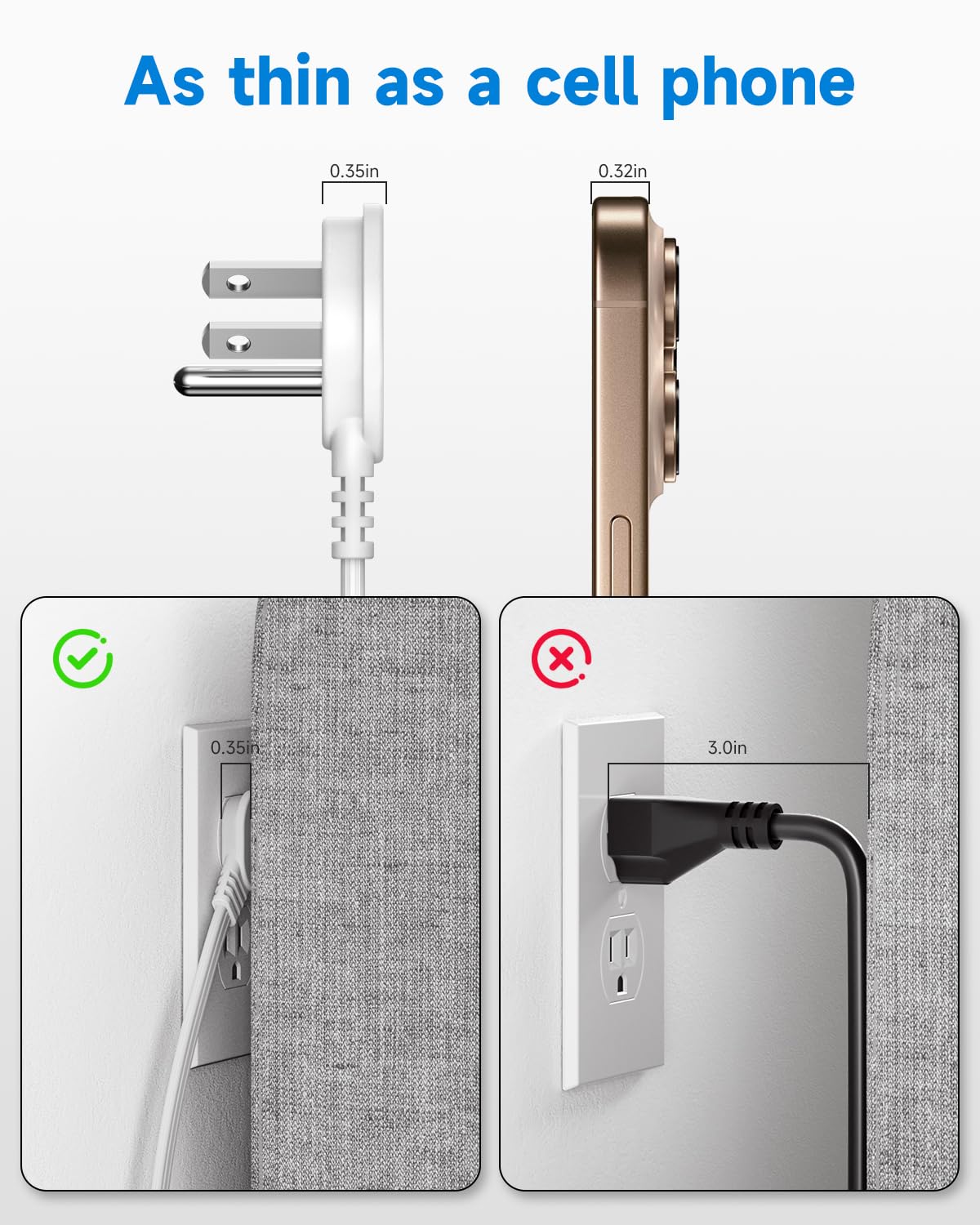 - Low-Profile Design: 0.35-inch ultra-slim profile fits tight spaces behind furniture, allowing appliances to sit flush against the wall. Ideal for sofas, TVs, bookshelves, cabinets, and bedside tables—saves space and keeps areas tidy