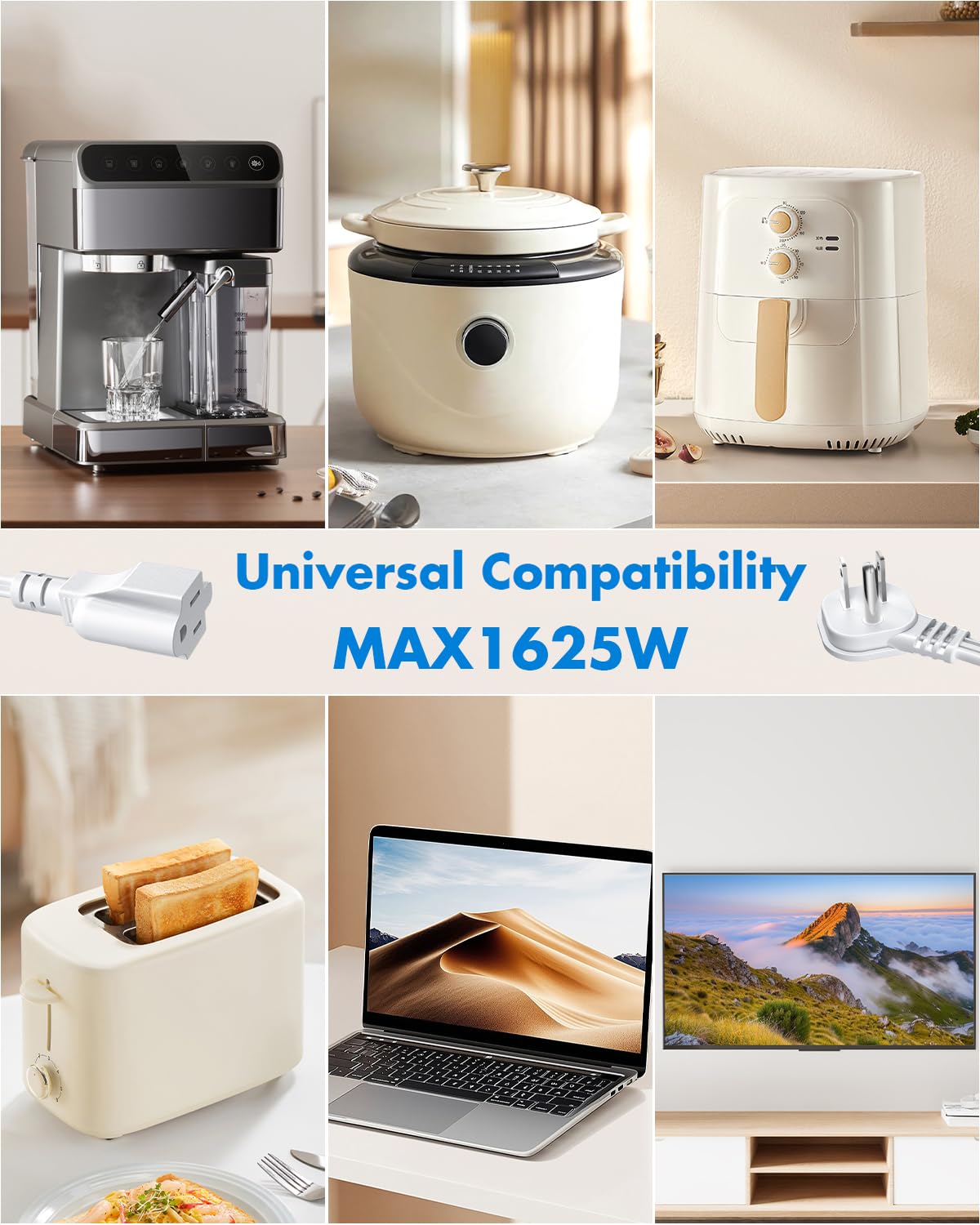- Wide Compatibility: Works with 3-prong & 2-prong devices. Safe for compact indoor spaces like homes and offices. Supports up to 1625W—ideal for toasters, microwaves (1500W), freezers, wall-mounted TVs, laptops, and lamps