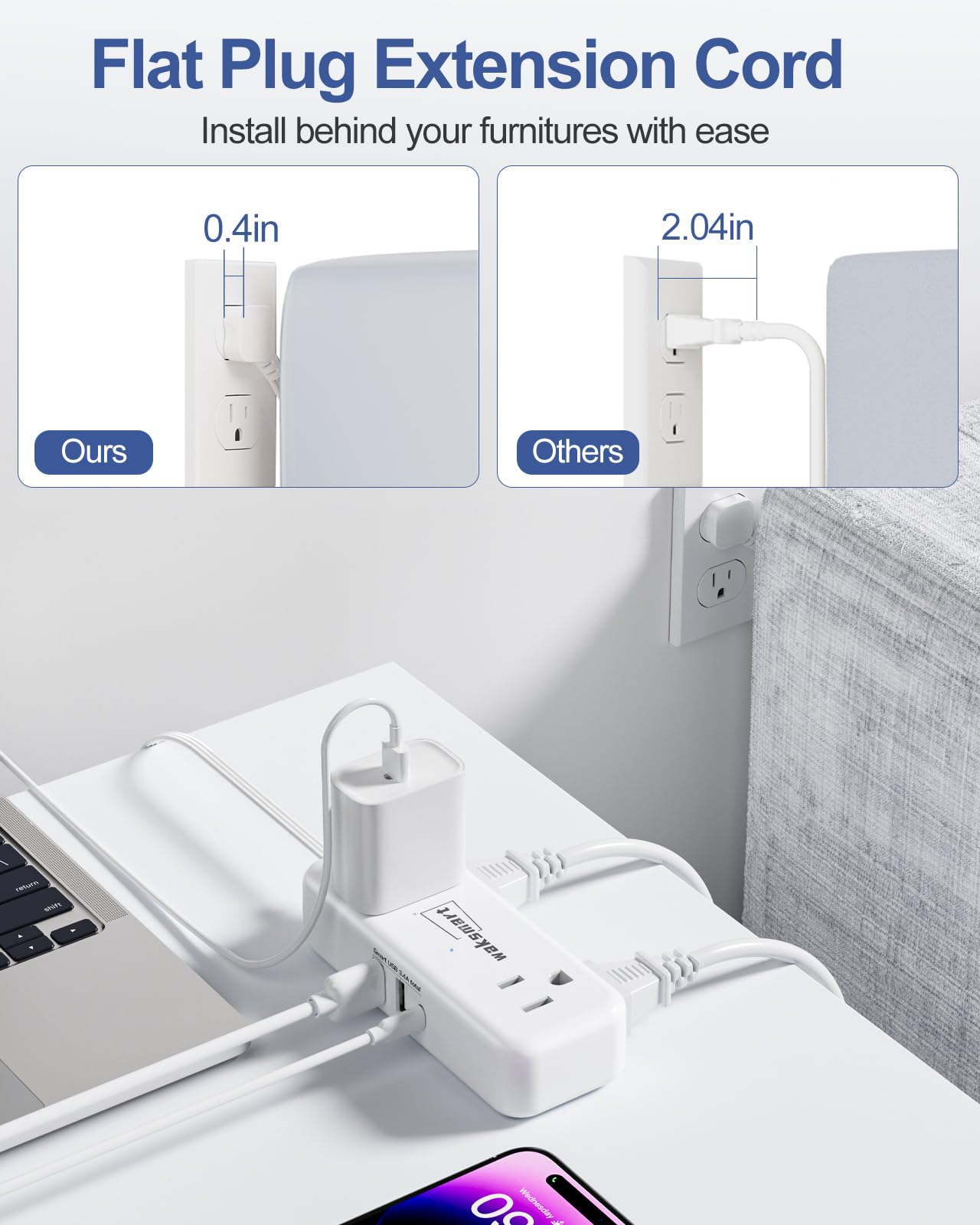 - 【Ultra Thin Flat Plug】Measuring only 0.4 inches, the ultra-thin flat plug allows for easy installation behind sofas, TV cabinets, and other furniture. Its 45° right-angle design prevents the blocking of other outlets