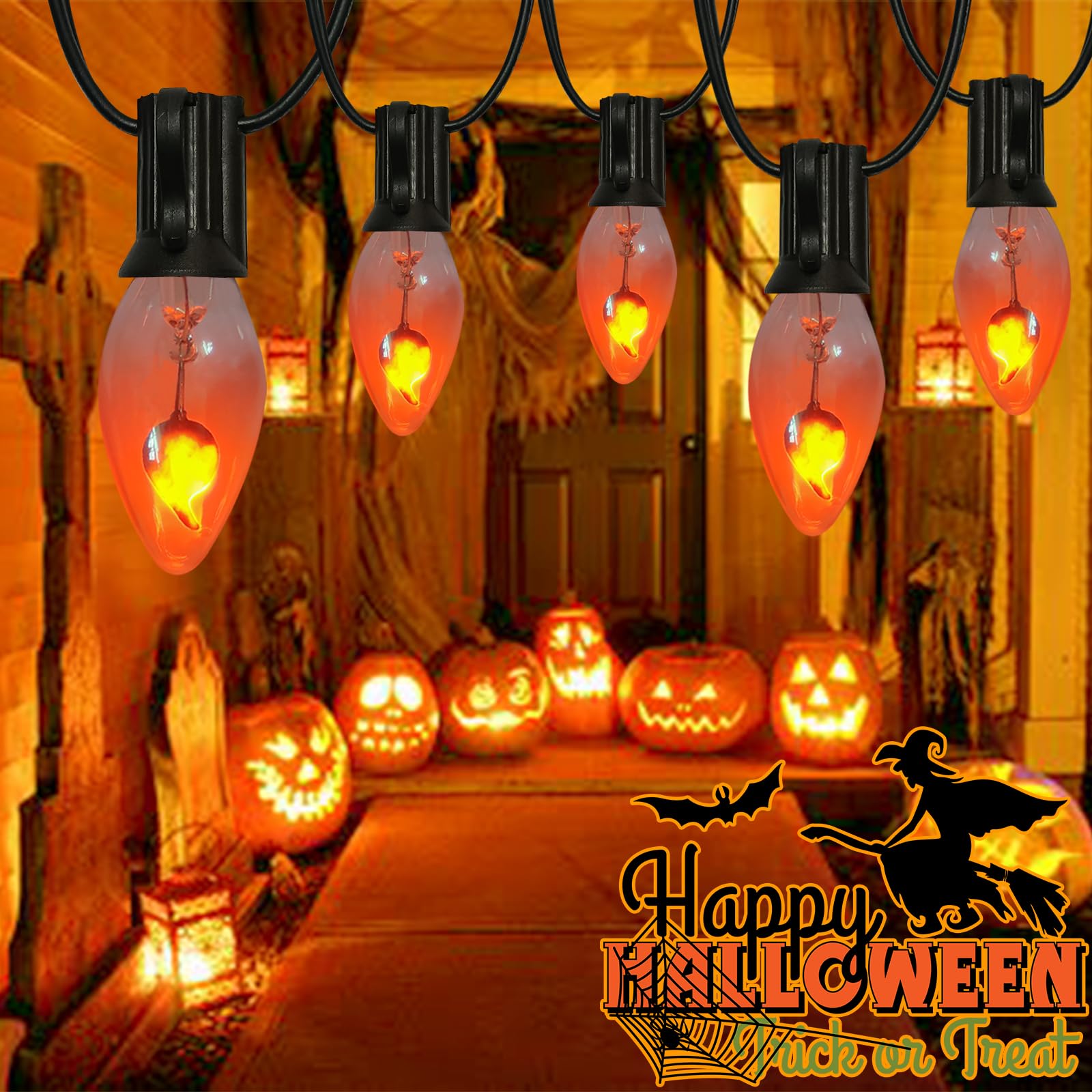 - Flame Effect Light Bulb: 12 counts C7 clear flame light bulbs have the retro style of Edison light bulb. Halloween light bulbs with a soft orange effect flame that flickers up and down, fit for Halloween and Christmas decorations.
