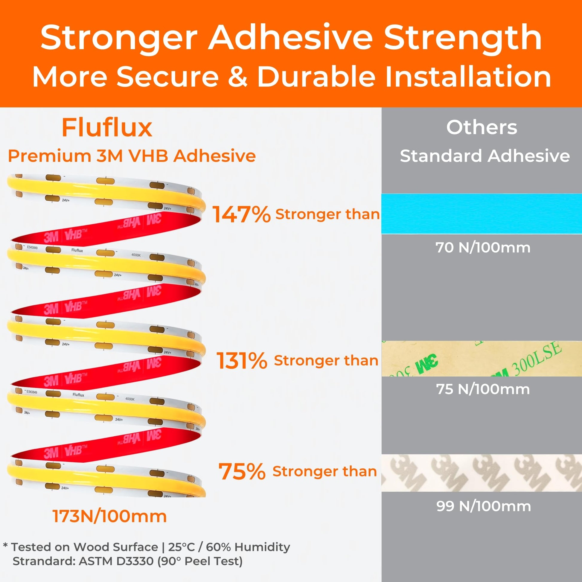 - Strong Adhesion: Equipped with premium 3M VHB self adhesive backing, this 24V DC diffused LED strip light sticks firmly to metal, glass, wood, and more—even slightly uneven surfaces. Removes easily without residue and resists heat and humidity