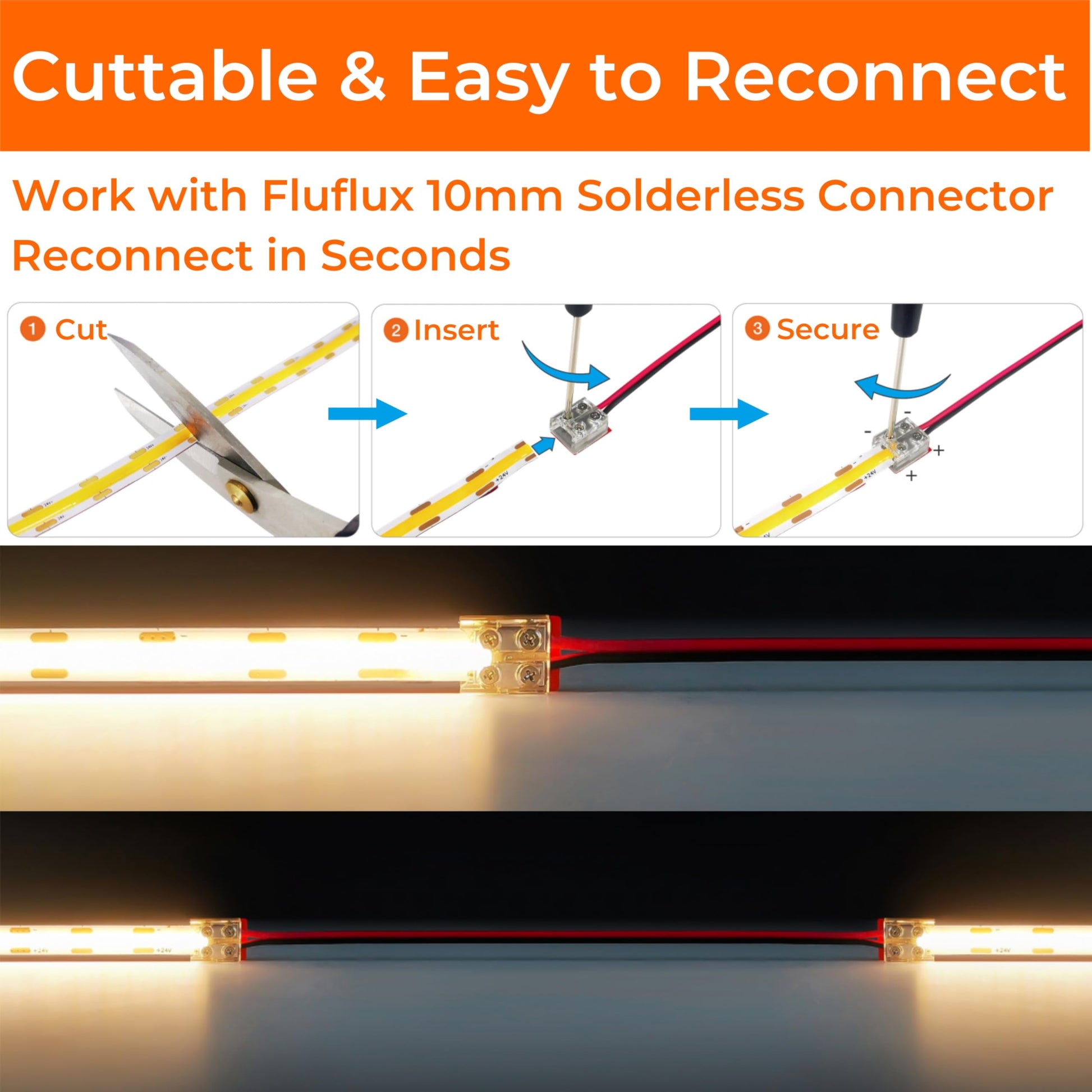 - Cuttable and Easy to Reconnect: Cut every 0.66" for precise lengths without damage. Use Fluflux 10mm 2-pin solderless connectors (sold separately) for seamless reconnection, this industrial COB LED strip is easy to extend or re-route around corners. No tools required