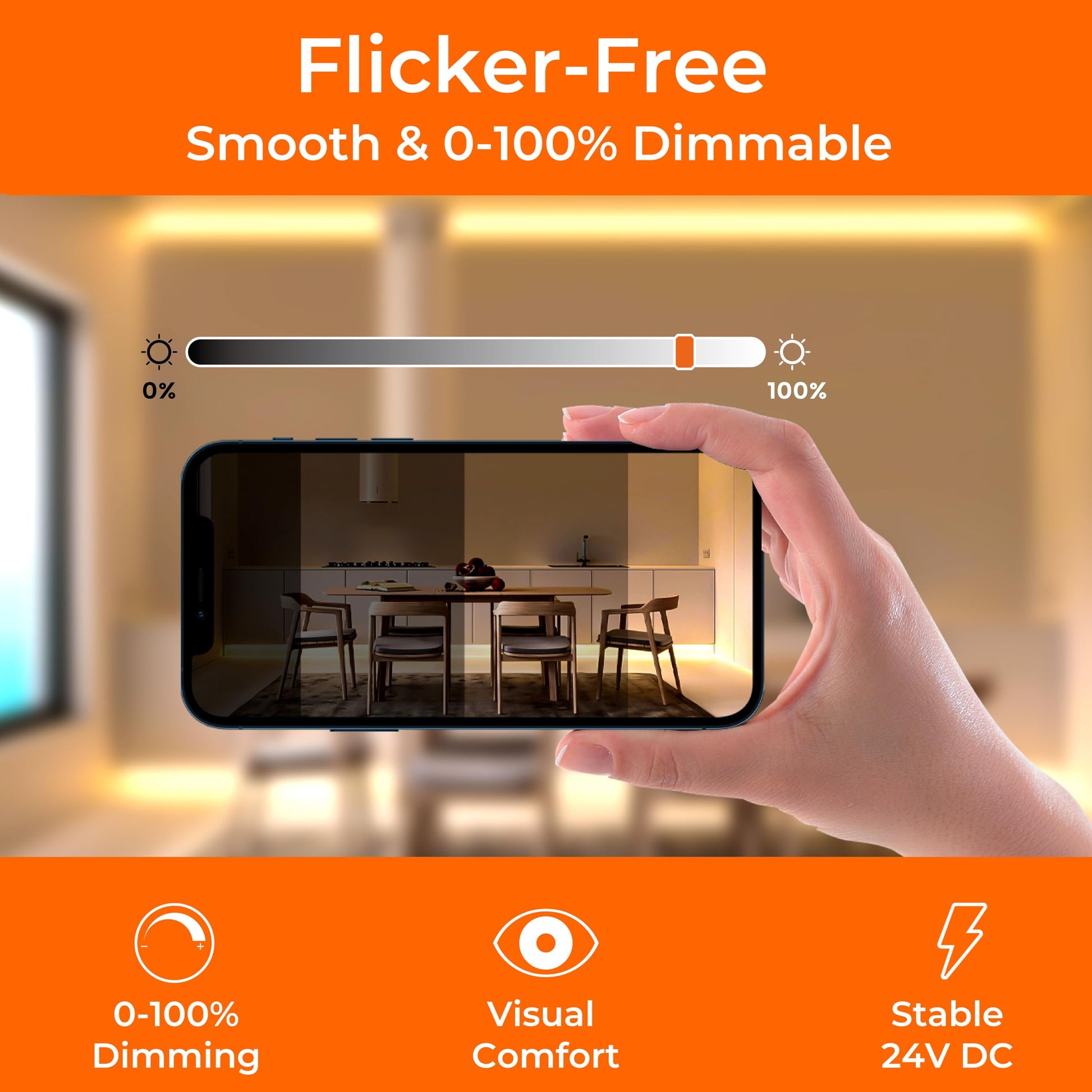 - Dimmable and Flicker-Free: Operating at 24V DC, this super bright led rope light is fully dimmable and compatible with TRIAC, ELV, MLV, 0-10V dimmable drivers, switches and smart home systems. Adjust brightness easily to create the perfect ambiance for homes, theaters, stages, lounges, retail spaces