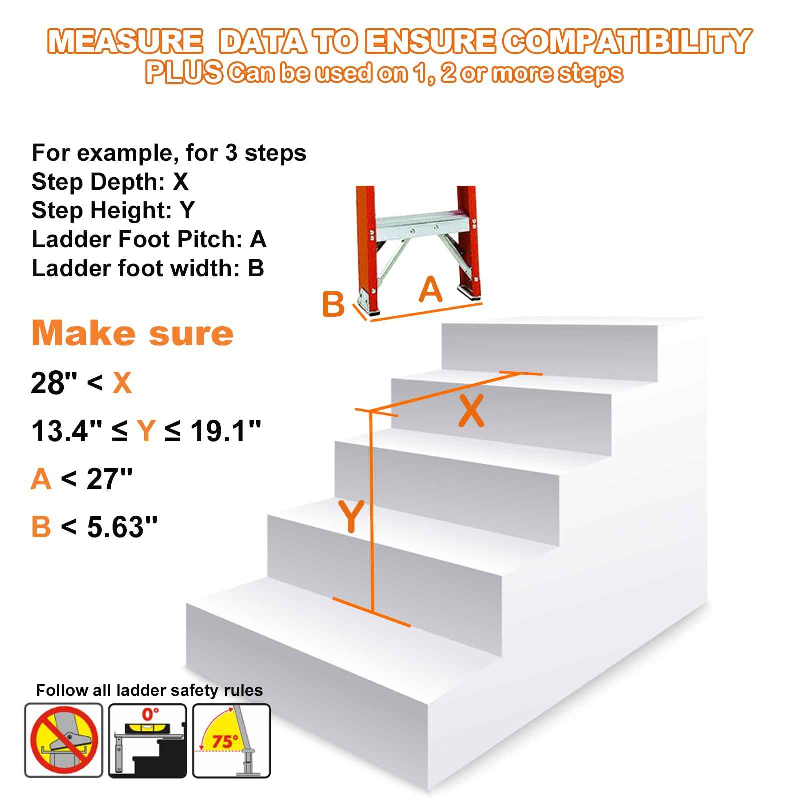- HEIGHT ADJUSTABLE LADDER STABILIZER--Stair ladder platform adjust from 13.4" to 19.1" in 0.47" each increments. The platform measures 27"x5.63" and the base 11.8" x 4.92". Use it to create a stable, level base on stairs. Verify these parameters to ensure compatibility with your stair step height before purchasing.