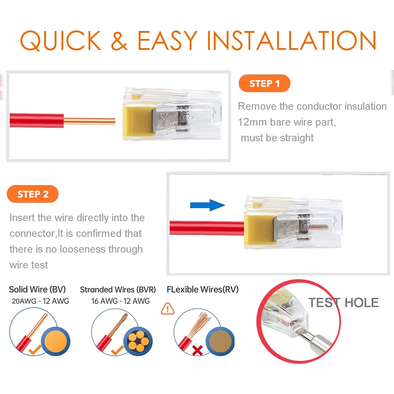 - [ PACKAGE INCLUDED ] - The Lever Wire Nuts Connectors kit are meet your common needs for joining 2-8 conductors (2P/50pcs , 4P/40pcs and 8P/10pcs).Simply push-in any combination of solid and stranded conductors (Wire range: 22-12 AWG Solid and 18-12 AWG Stranded).