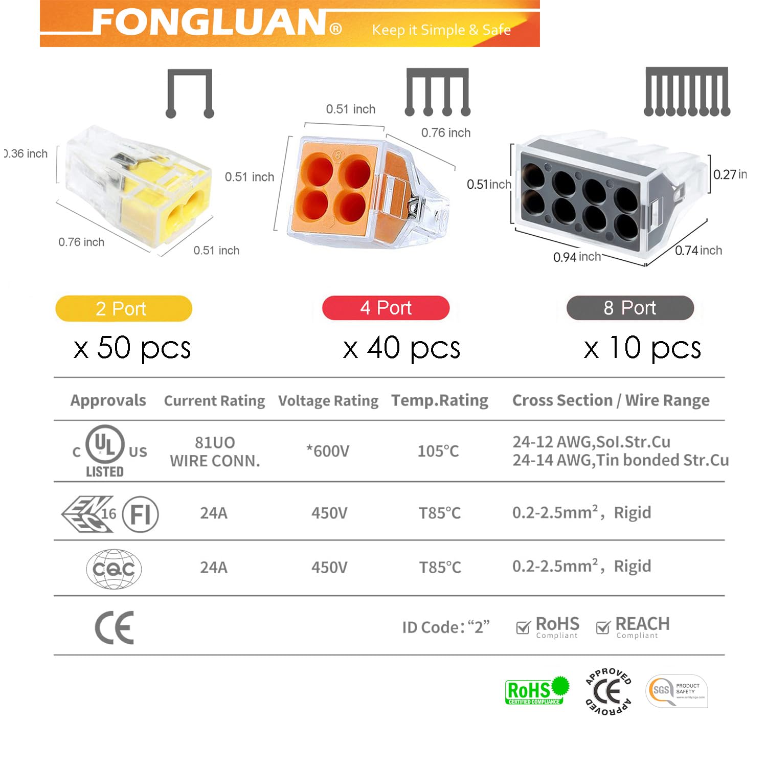 FONGLUAN 100pcs Push-in Wire Connector Splicing Terminals for Solid and Stranded Conductors with 2/4/8 Wires