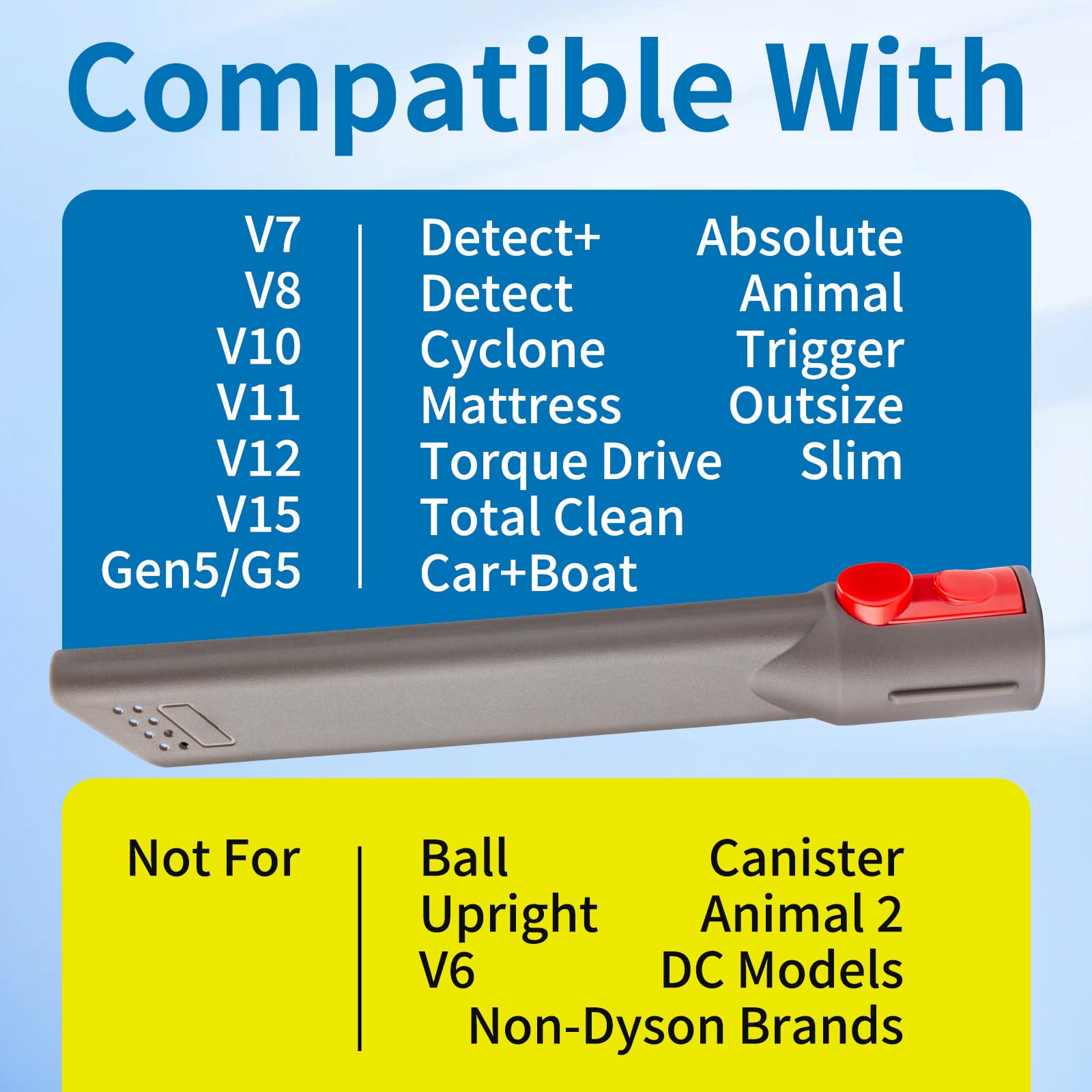 - For Dyson Crevice Tool Replacement: This crevice tool with nozzle compatible with Dyson handheld cordless Gen5 G5 V7 V8 V10 V11 V15 Outsize detect, detect+, outsize, torque drive, absolute, animal, cyclone, total clean, car+boat vacuum cleaners.(WARM TIPS: Not for Dyson V6, DC series, ball/canister type animal models, Not for any non-Dyson vacuum cleaners)